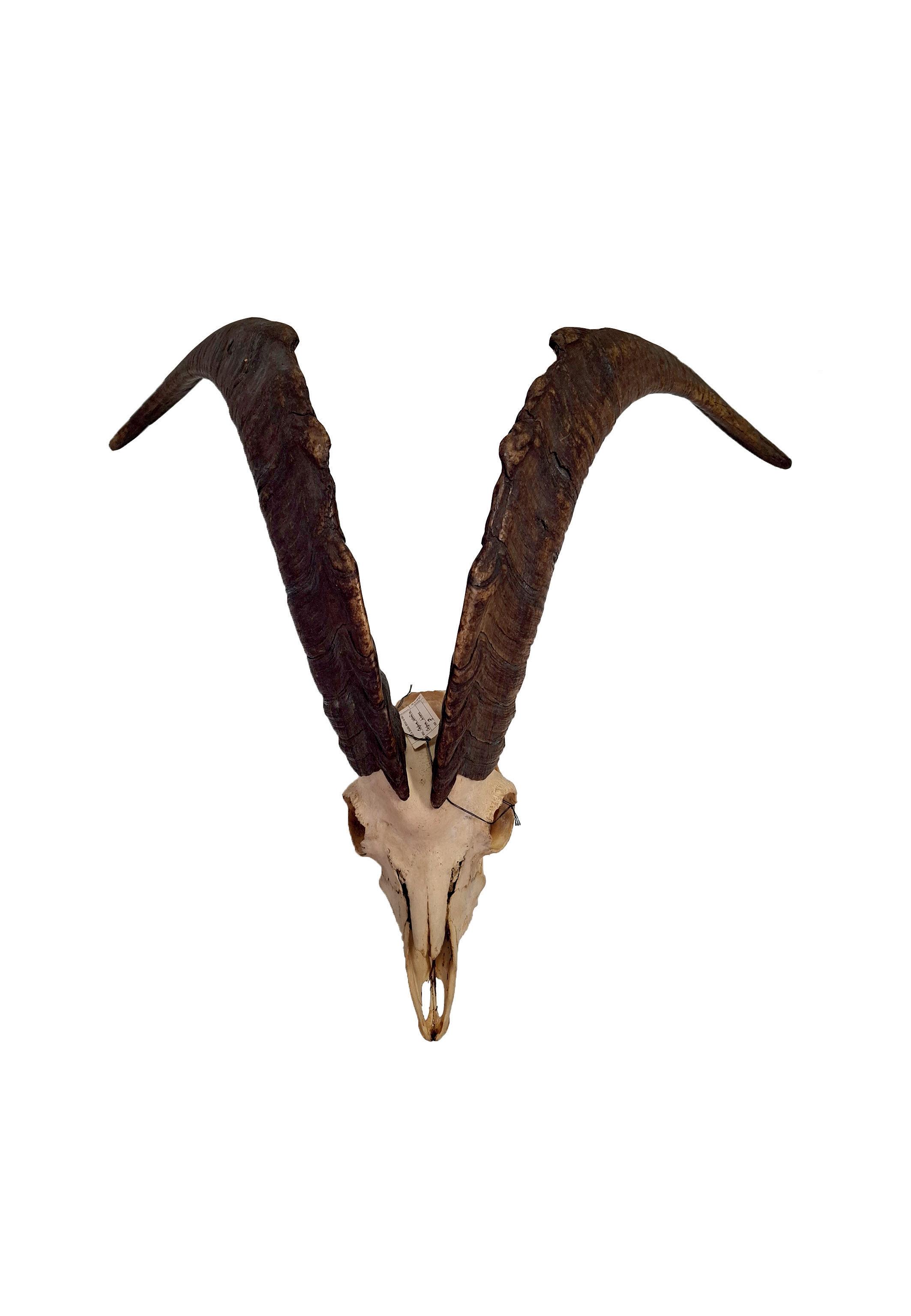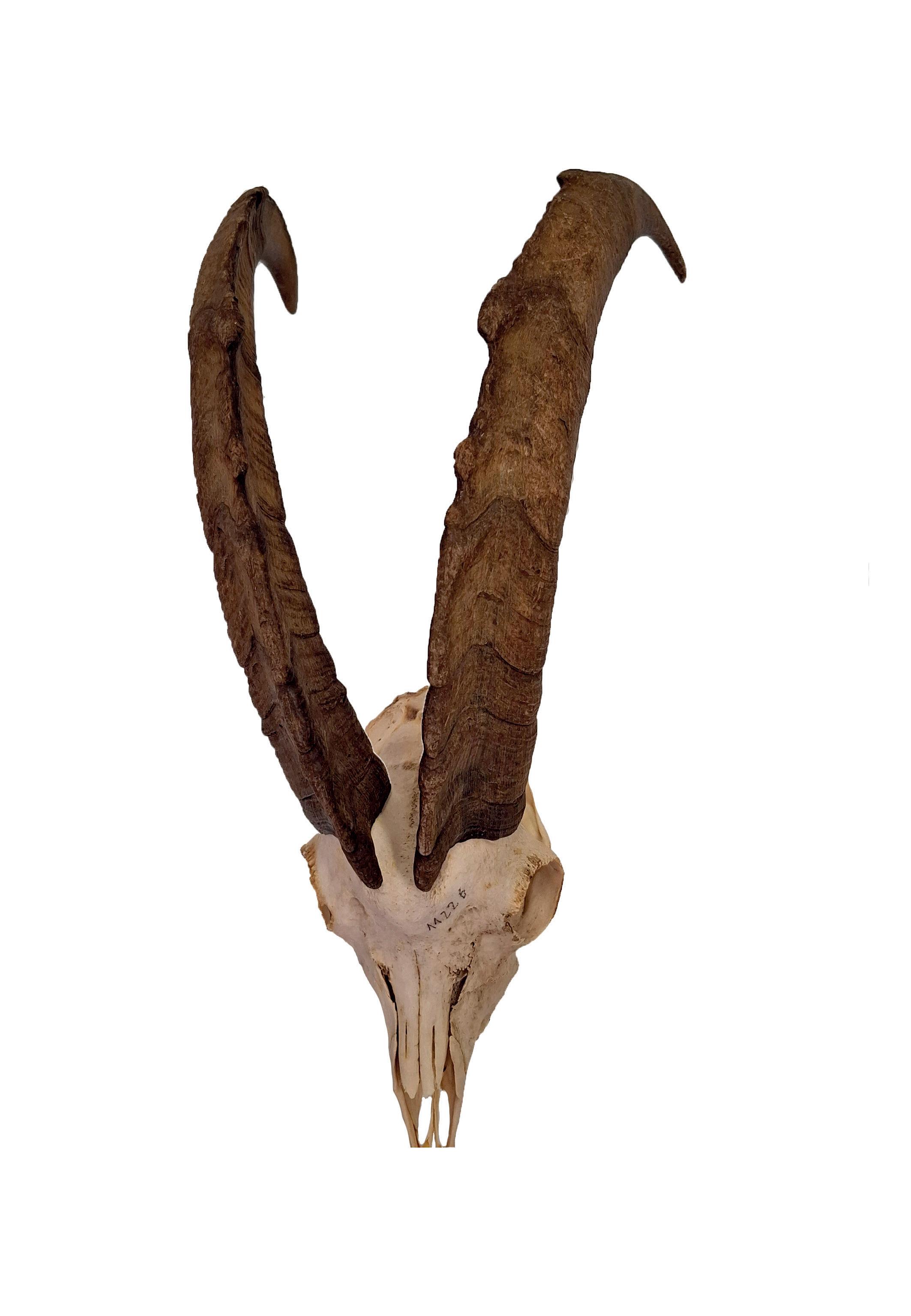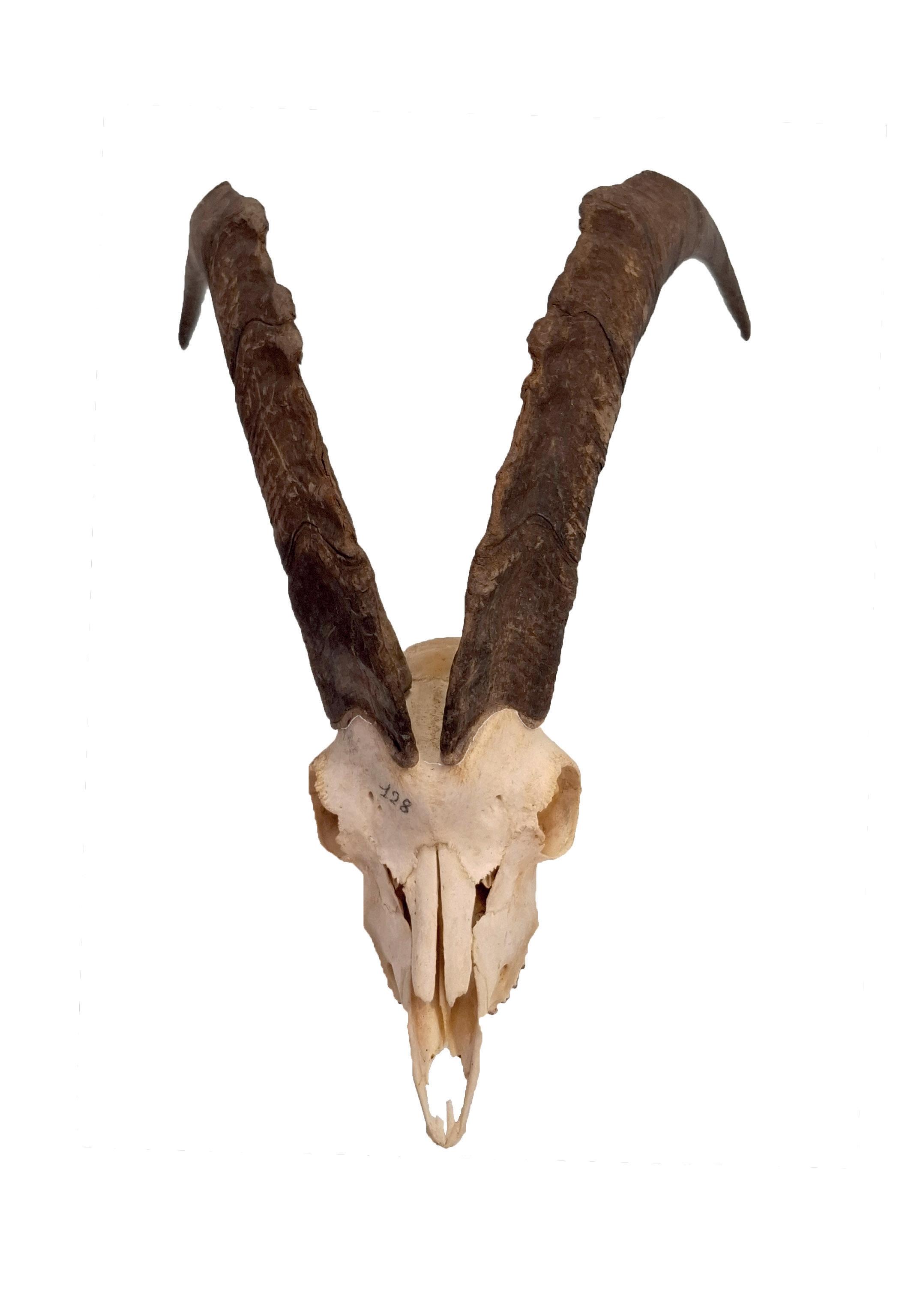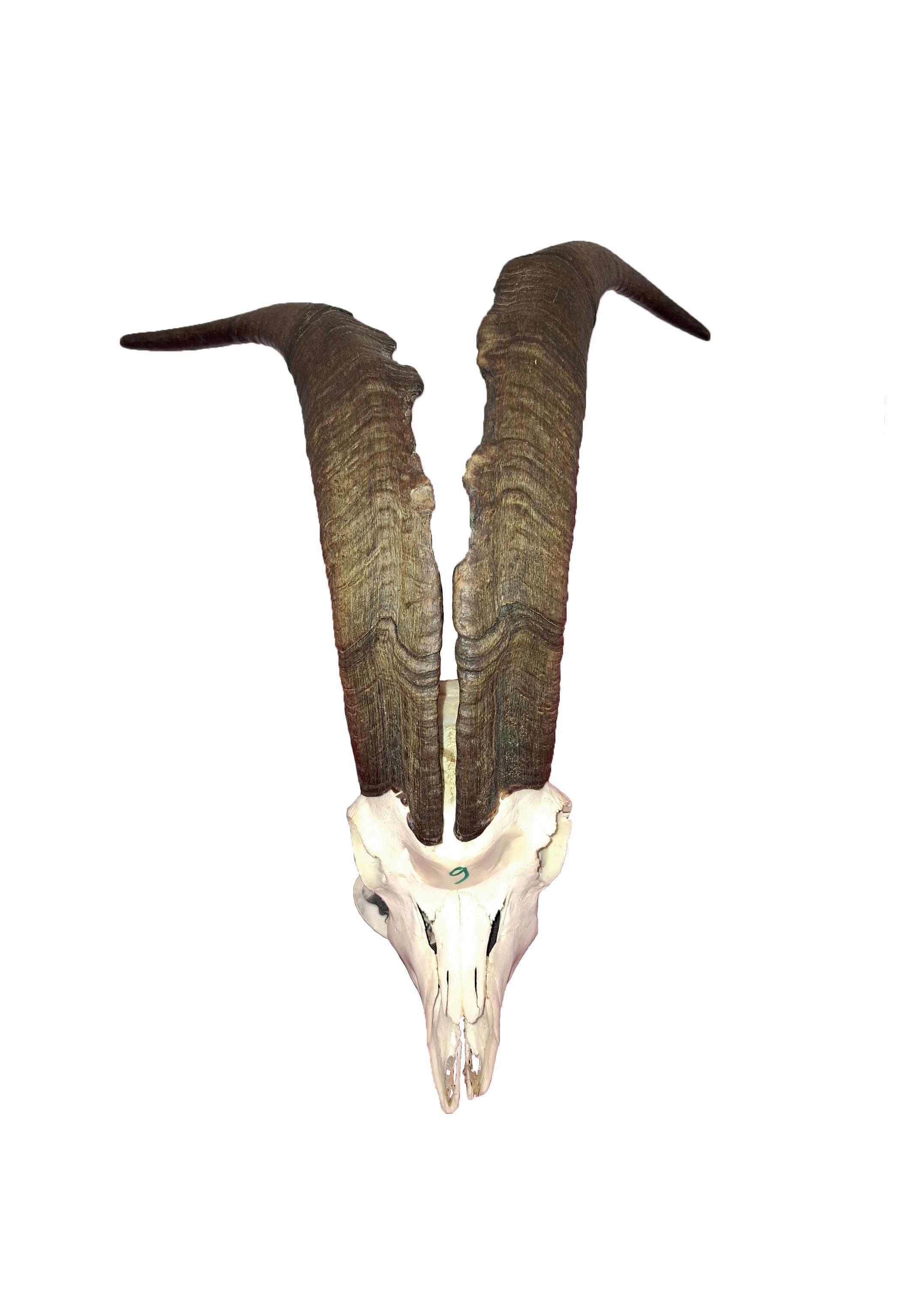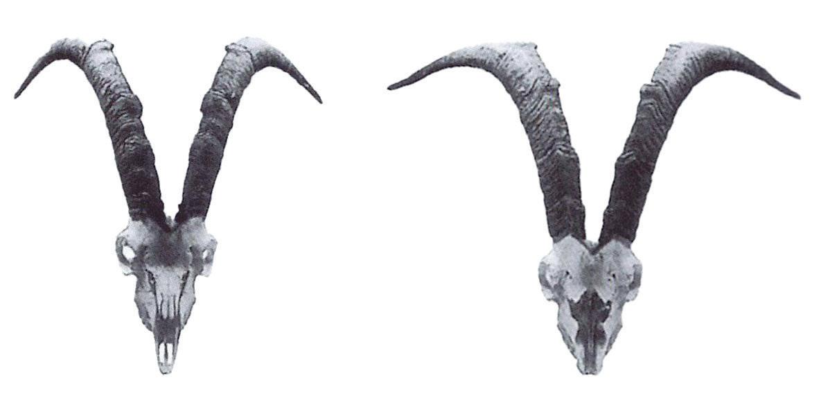 Two fairly well-defined morphological types can be distinguished, although intermediate cases are not uncommon (Cagnolaro et al., 1981, Spagnesi et al., 1982, 1986). The first type, essentially scimitar-shaped, has individual horns pointing backward and downward, with modest inter-apical divergence: it resembles the horns of the Cretan wild goat. The second type develops more laterally, with a wide inter-apical divergence and presents greater similarities with the horns of some domestic goat breeds. The difference between the two types of horns is not only evident in the inter-apical divergence, but also in the angle formed by the major axis of the horn section at various levels and the intersection of the plane of that region with the sagittal plane of the skull. This angular value, given the same percentage level of horn development, is much lower in the “scimitar” type than in the second type. The horns have a roughly pear-shaped cross-section, highly compressed, with only the antero-internal angle raised, keeled, and featuring widely spaced protuberances at a certain distance from the base.