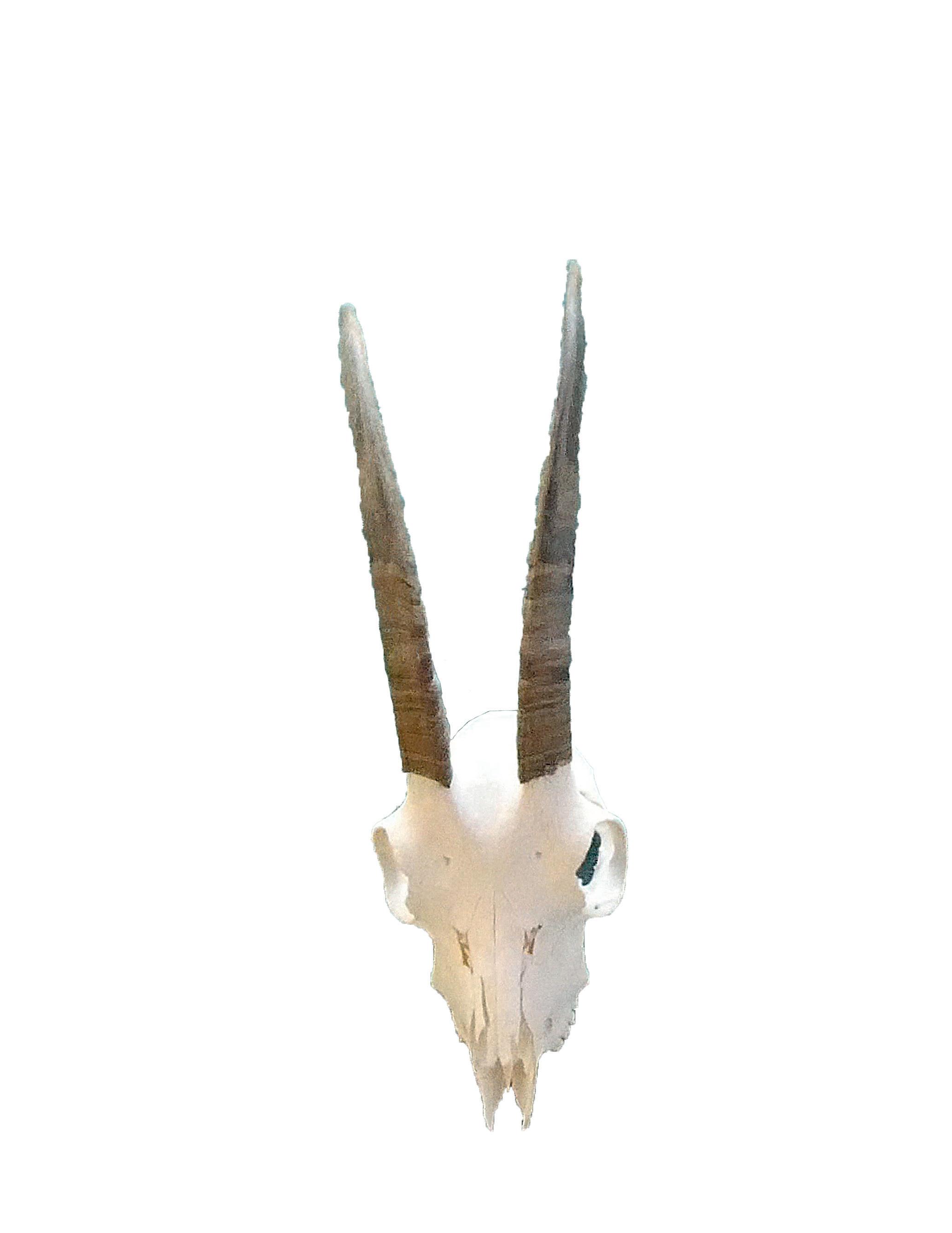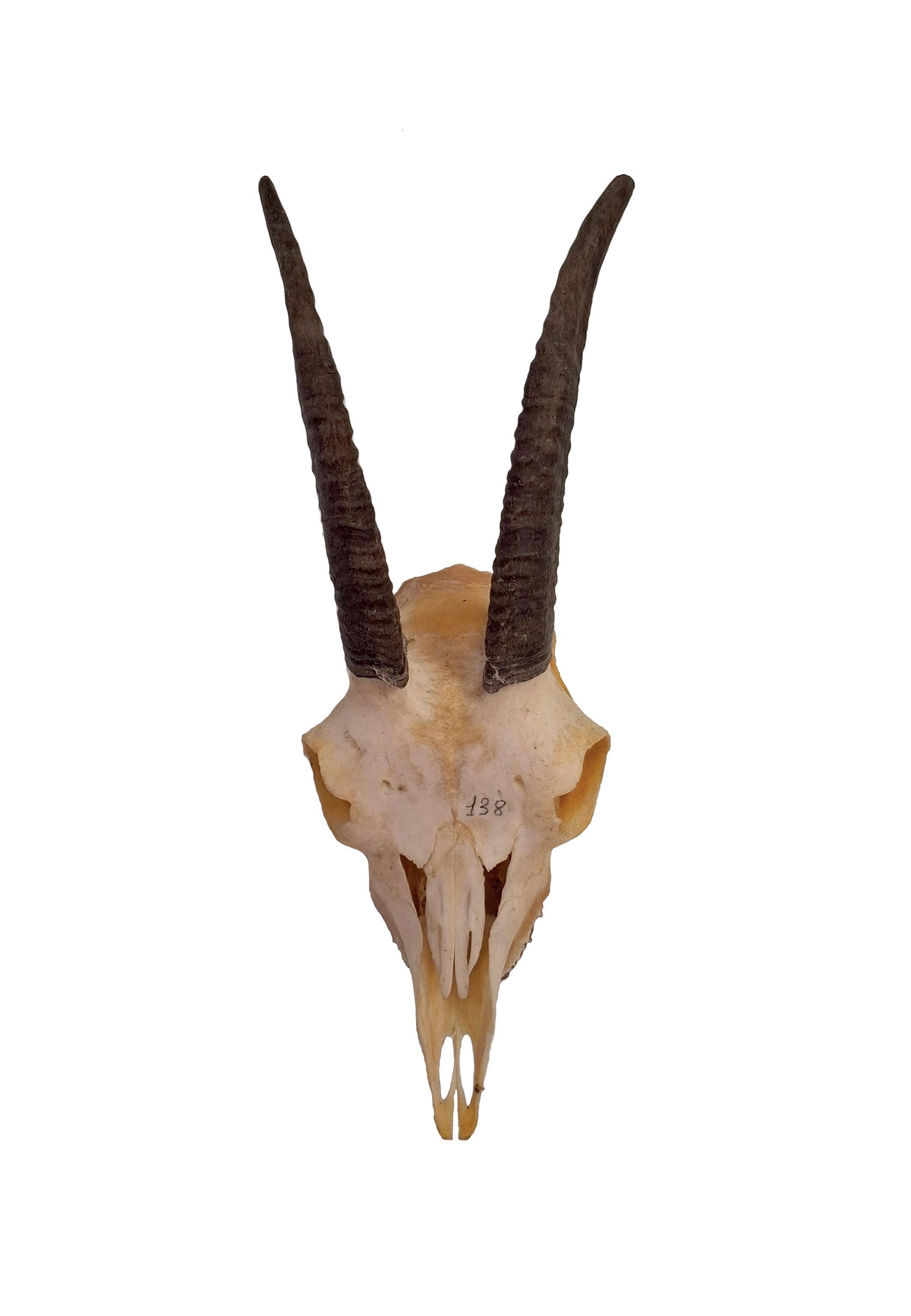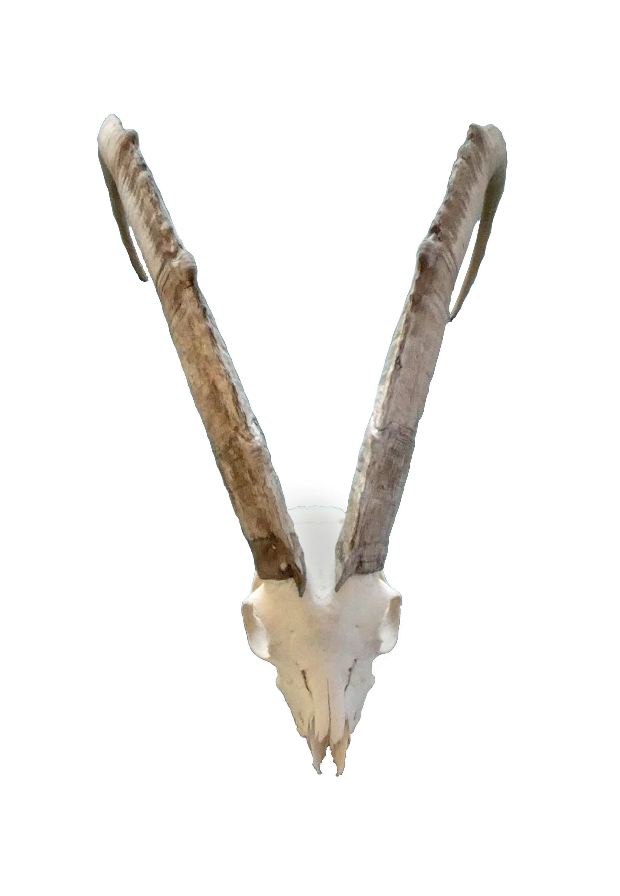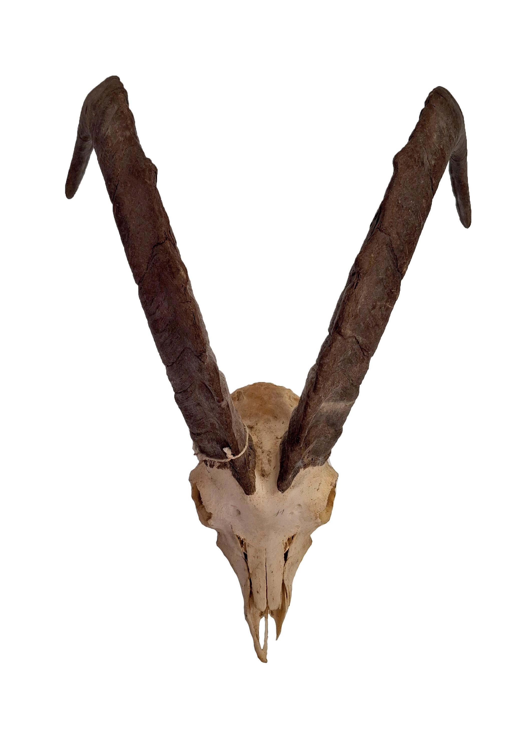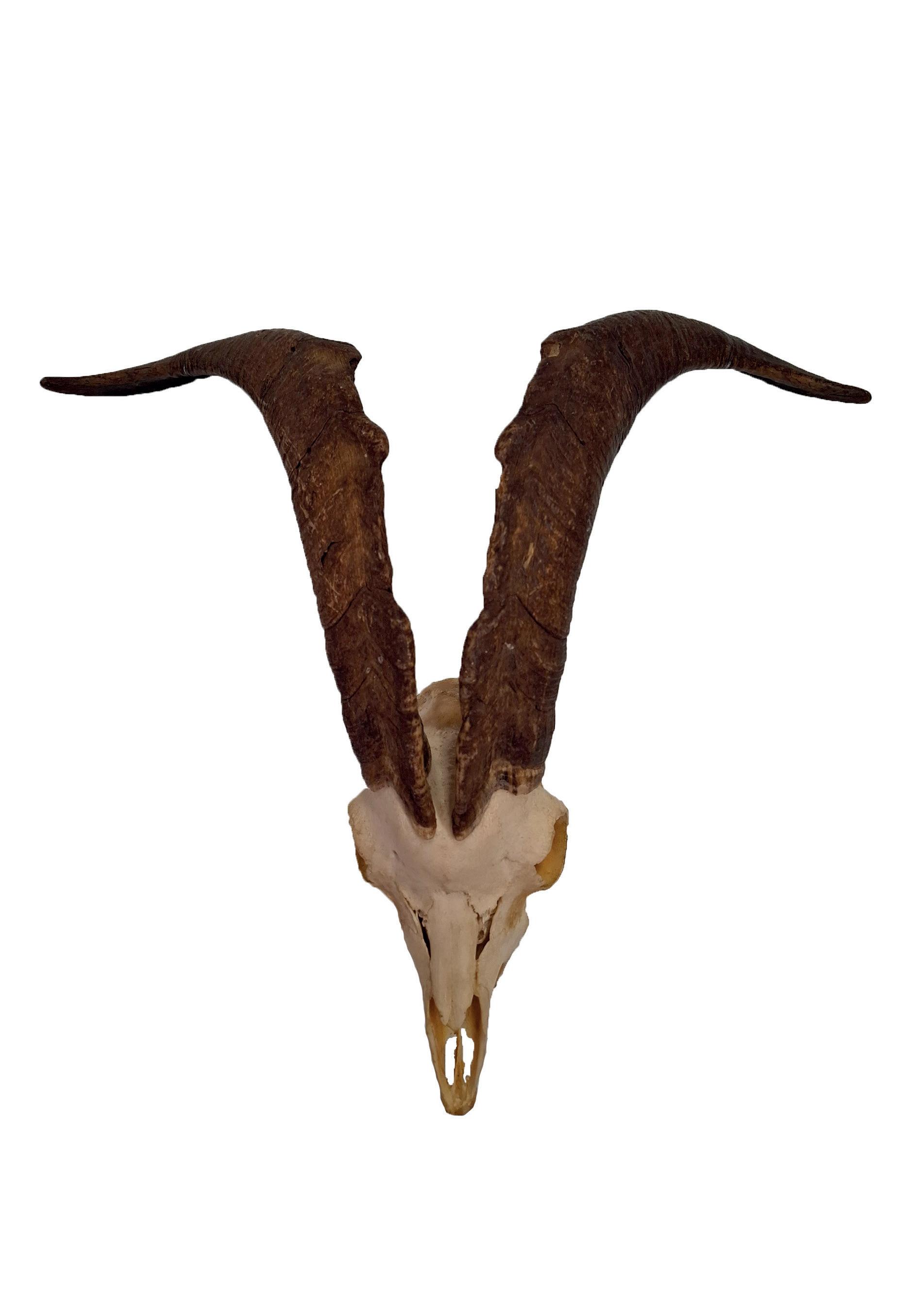 Two fairly well-defined morphological types can be distinguished, although intermediate cases are not uncommon (Cagnolaro et al., 1981, Spagnesi et al., 1982, 1986). The first type, essentially scimitar-shaped, has individual horns pointing backward and downward, with modest inter-apical divergence: it resembles the horns of the Cretan wild goat. The second type develops more laterally, with a wide inter-apical divergence and presents greater similarities with the horns of some domestic goat breeds. The difference between the two types of horns is not only evident in the inter-apical divergence, but also in the angle formed by the major axis of the horn section at various levels and the intersection of the plane of that region with the sagittal plane of the skull. This angular value, given the same percentage level of horn development, is much lower in the “scimitar” type than in the second type. The horns have a roughly pear-shaped cross-section, highly compressed, with only the antero-internal angle raised, keeled, and featuring widely spaced protuberances at a certain distance from the base.