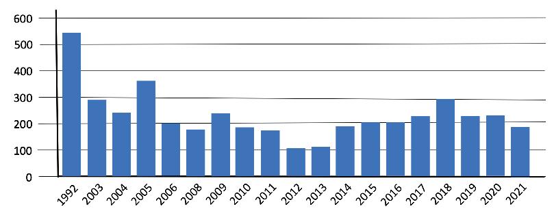 • After 2012, the population appears to be clearly recovering and in 2018 reaches values close to those recorded in the early 2000s, remaining at these values in the following years.