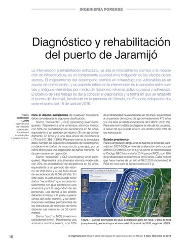 Diagnóstico y rehabilitación del puerto de Jaramijó La intervención o rehabilitación estructural, ya sea el reforzamiento sísmico o la reparación de infraestructura, es un componente esencial en la mitigación de los efectos de los sismos. El mejoramiento del desempeño sísmico en infraestructuras vulnerables es un asunto de primer orden, y un aspecto crítico en la intervención es la conexión entre nuevos y antiguos elementos por medio de fijaciones, refuerzo activo o pasivo y adhesivos. El objetivo de este trabajo es dar a conocer el diagnóstico y la forma en que se rehabilitó el puerto de Jaramijó, localizado en la provincia de Manabí, en Ecuador, colapsado durante el sismo del 16 de abril de 2016. TOMÁS MOROCHO LLINÍN Ingeniero civil con maestría y doctorado. Especialista en patología e ingeniería forense.