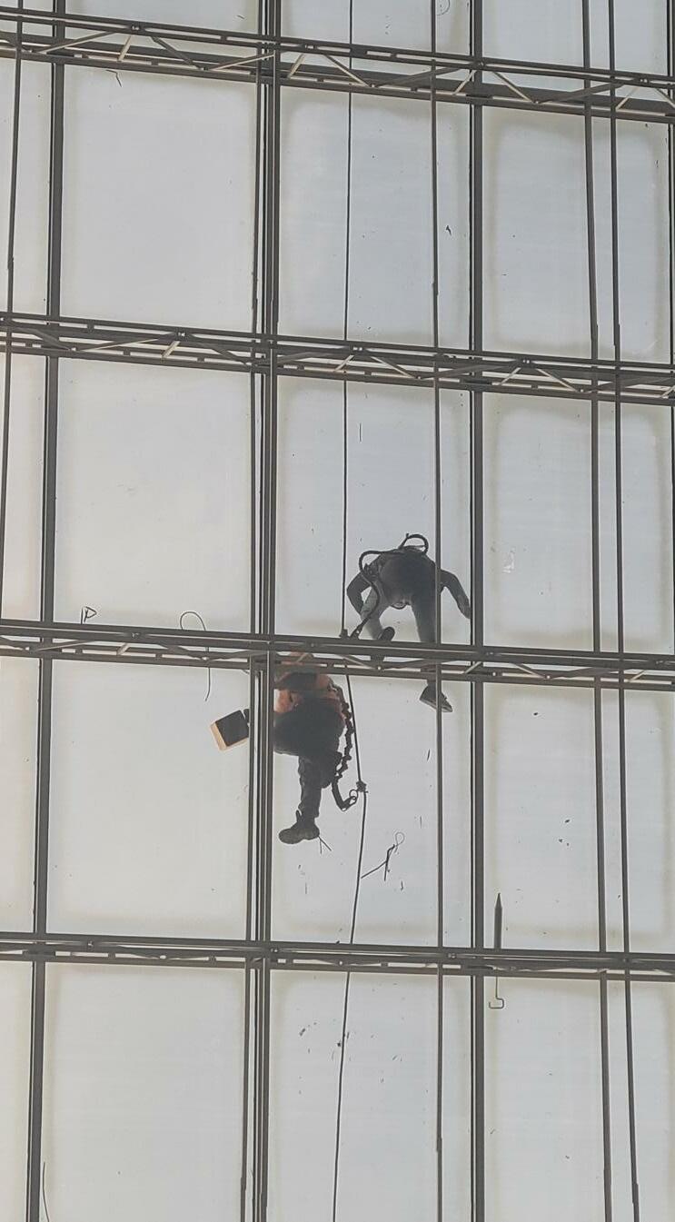 I decided to do some research on these types of workers. This is dangerous work with terrifying heights and spectacular views. The worker’s inch along knitted in full body harnesses with lines clipped to their backs and materials tied off to prevent them from falling.