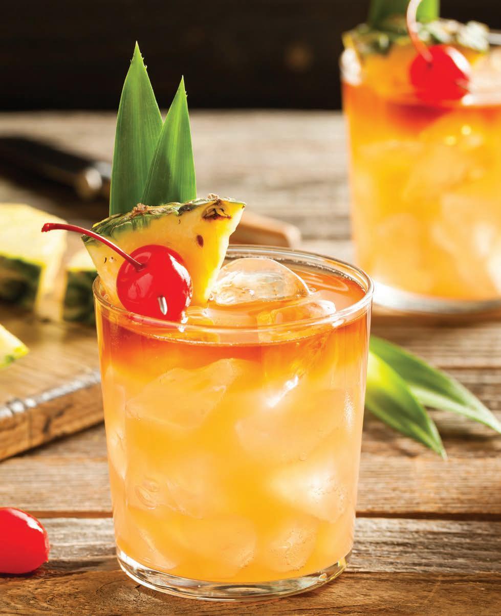 2 Garnish with the pineapple wedge and maraschino cherry.