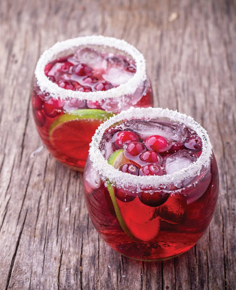 3 Place ice in the rimmed glass, strain the cocktail into it, and garnish with the lime wheel and handful of cranberries.