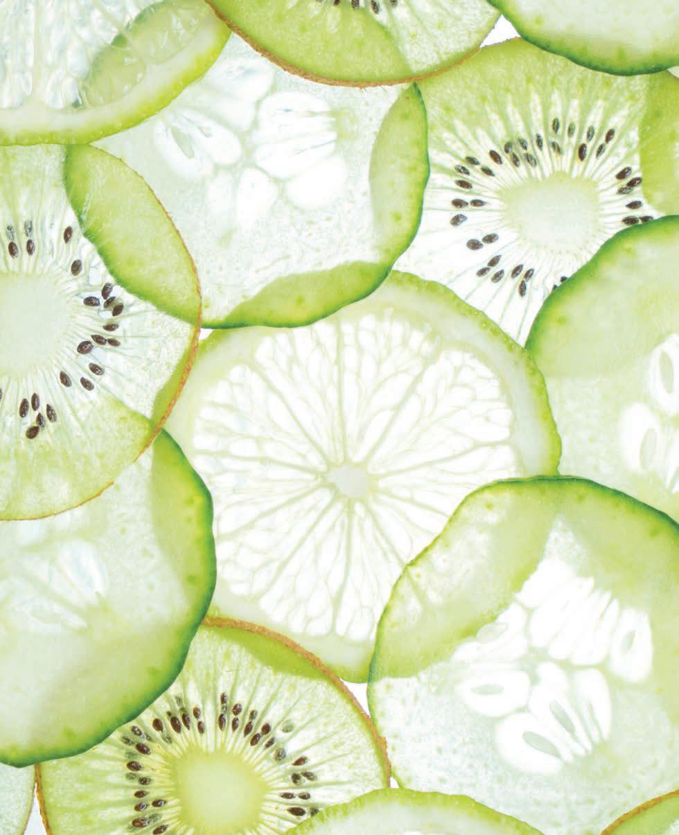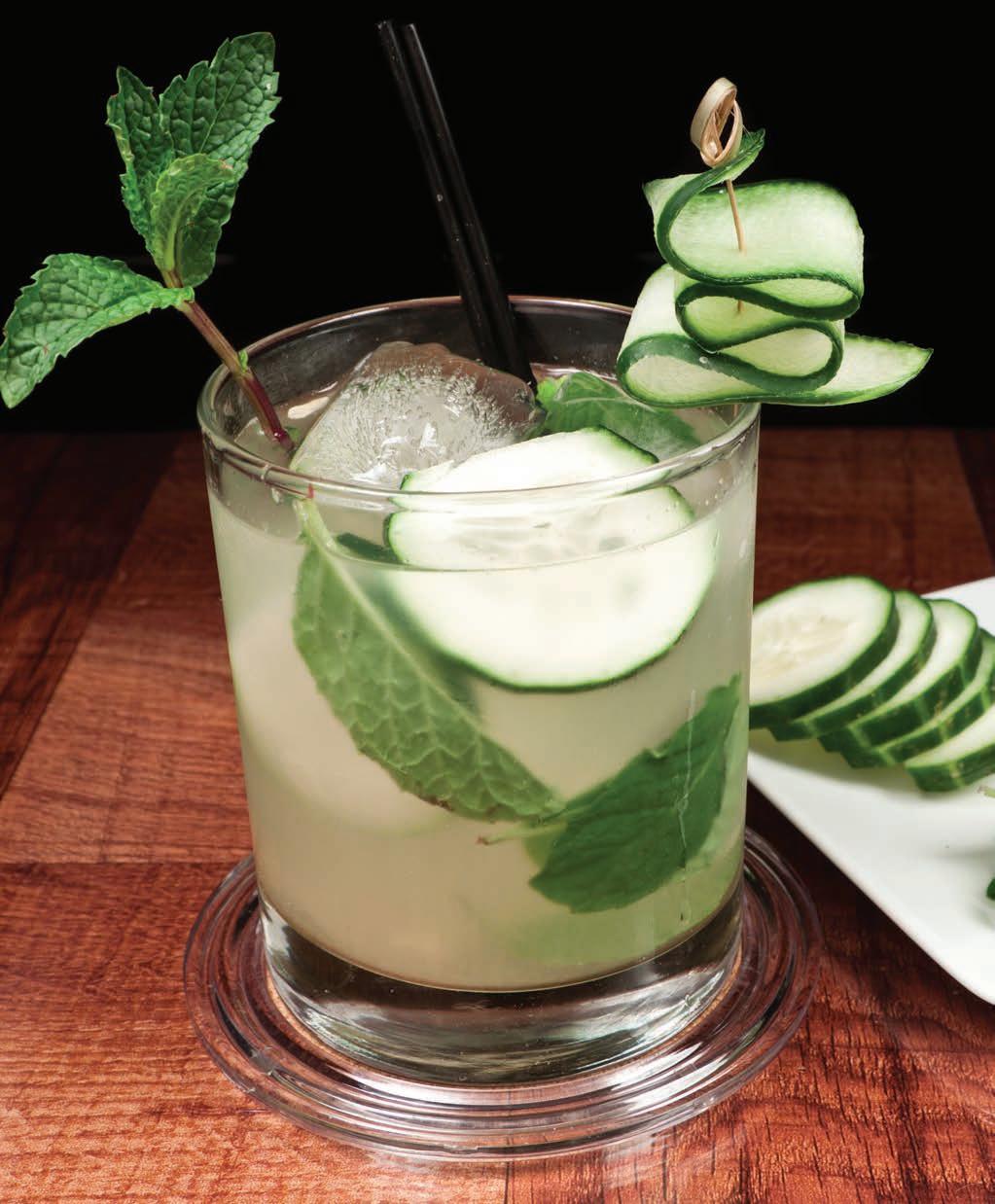 4 Fill the glass with ice, strain the cocktail into the glass, and garnish with additional mint, the lime wedge, and the cucumber slices.