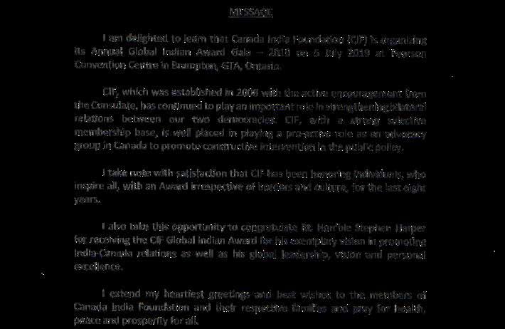 Congratulations to Hon. Stephen Harper on receiving the Global Indian Award & best wishes to Canada India Foundation for the 2019 Annual Gala