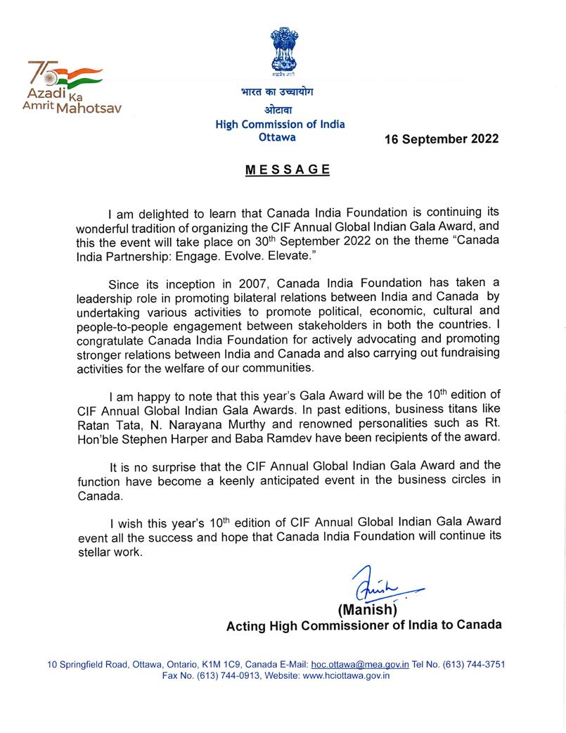 I am pleased to extend my warmest greetings to everyone attending the 2022 Global Indian Award Gala, hosted by the Canada India Foundation (CIF)