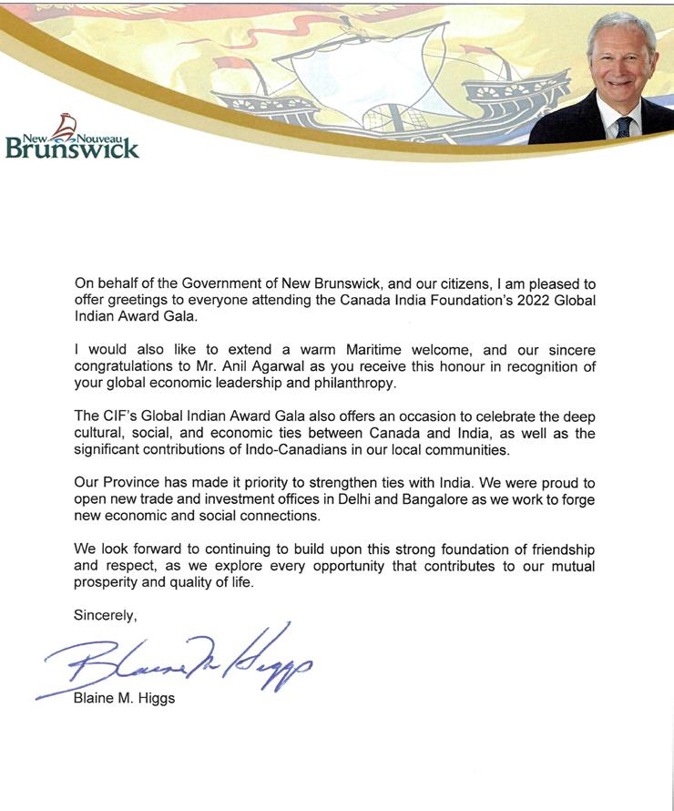 The CIF Global Indian Award pays tribute to citizens who have demonstrated global leadership, vision and personal excellence. I would like to congratulate this year’s award recipient, Mr. Anil Agarwal. Your many accomplishments make you most deserving of this prestigious honour.