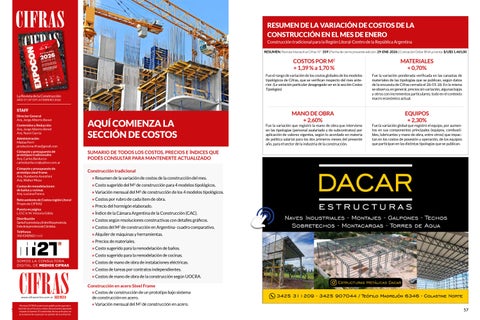 $ 30.183,66 En cada publicación se desarrollará los costos de construcción de un prototipo bajo sistema de construcción en seco con exclusividad para Revista CIFRAS. El interés es poder brindar costos de referencia para sistema de construcción en seco Steel Framing y Drywall. Los costos de materiales resultan de los relevamientos realizados por la empresa, siendo considerado el precio promedio entre diferentes oferentes de mercado. La mano de obra se desarrolló considerando los costos de producción bajo sistema de con-tratación UOCRA. Los resultados finales en ambos casos contemplan IVA (21%), Gastos Generales y Beneficios. 2
