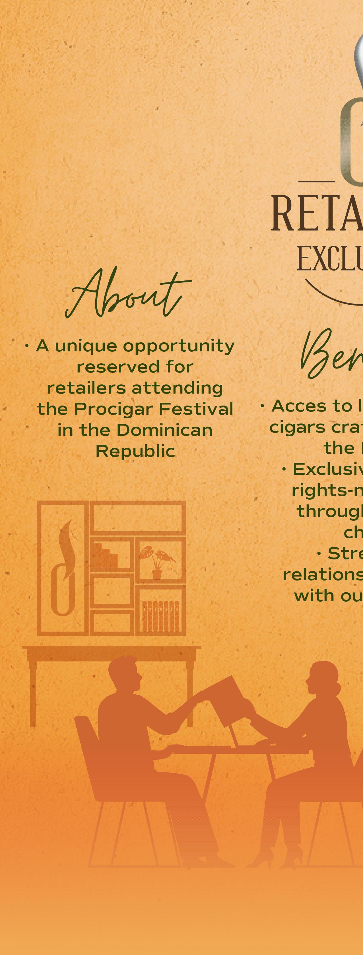 The PROCIGAR Retailer Exclusive Program offers a one-of-a-kind opportunity for cigar retailers worldwide to access limited-edition cigars crafted exclusively for the Festival by PROCIGAR member factories. This initiative allows participants to purchase these exclusive cigars, unavailable through any other channel, while promoting direct relationships with the most prestigious manufacturers in the Dominican Republic. Participation in this program is reserved for officially registered retailers attending the Festival. Each participating retailer will have priority access to an exclusive space designed to facilitate meetings and purchasing opportunities with PROCIGAR members in a professional and private environment.