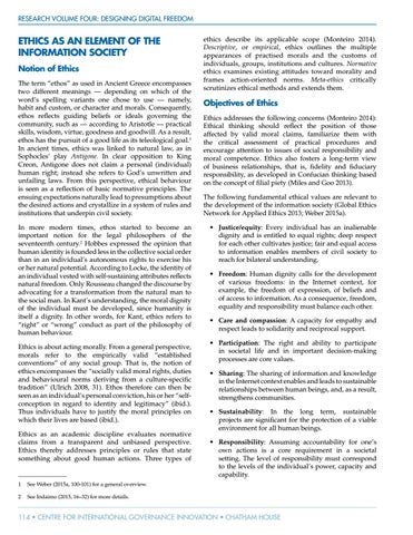 Objectives of Ethics Ethics addresses the following concerns (Monteiro 2014): Ethical thinking should reflect the position of those affected by valid moral claims, familiarize them with the critical assessment of practical procedures and encourage attention to issues of social responsibility and moral competence. Ethics also fosters a long-term view of business relationships, that is, fidelity and fiduciary responsibility, as developed in Confucian thinking based on the concept of filial piety (Miles and Goo 2013). The following fundamental ethical values are relevant to the development of the information society (Global Ethics Network for Applied Ethics 2013; Weber 2015a). • Justice/equity: Every individual has an inalienable dignity and is entitled to equal rights; deep respect for each other cultivates justice; fair and equal access to information enables members of civil society to reach for bilateral understanding. • Freedom: Human dignity calls for the development of various freedoms: in the Internet context, for example, the freedom of expression, of beliefs and of access to information. As a consequence, freedom, equality and responsibility must balance each other. • Care and compassion: A capacity for empathy and respect leads to solidarity and reciprocal support. • Participation: The right and ability to participate in societal life and in important decision-making processes are core values. • Sharing: The sharing of information and knowledge in the Internet context enables and leads to sustainable relationships between human beings, and, as a result, strengthens communities. • Sustainability: In the long term, sustainable projects are significant for the protection of a viable environment for all human beings. • Responsibility: Assuming accountability for one’s own actions is a core requirement in a societal setting. The level of responsibility must correspond to the levels of the individual’s power, capacity and capability.