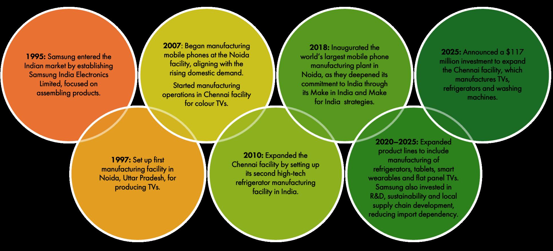 Samsung: Samsung, which entered India in 1995, has become a cornerstone of the country’s electronics manufacturing landscape (see Figure 5). With major facilities in Noida (Uttar Pradesh) and Sriperumbudur (Tamil Nadu), Samsung produces smartphones, TVs and home appliances locally. Its Noida plant, one of the world’s largest mobile factories, caters to both domestic and export markets. Aligned with the Make in India and Make for India initiatives, Samsung has invested significantly in R&D, local sourcing and skill development, creating thousands of jobs and a robust supply chain. Its long-term commitment has made Samsung a model for hightech, large-scale manufacturing success in India.