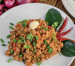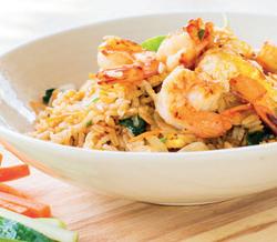 Stegte risnudler med tigerrejer, æg, tofu, thai forårsløg, bønnespirer og peanuts