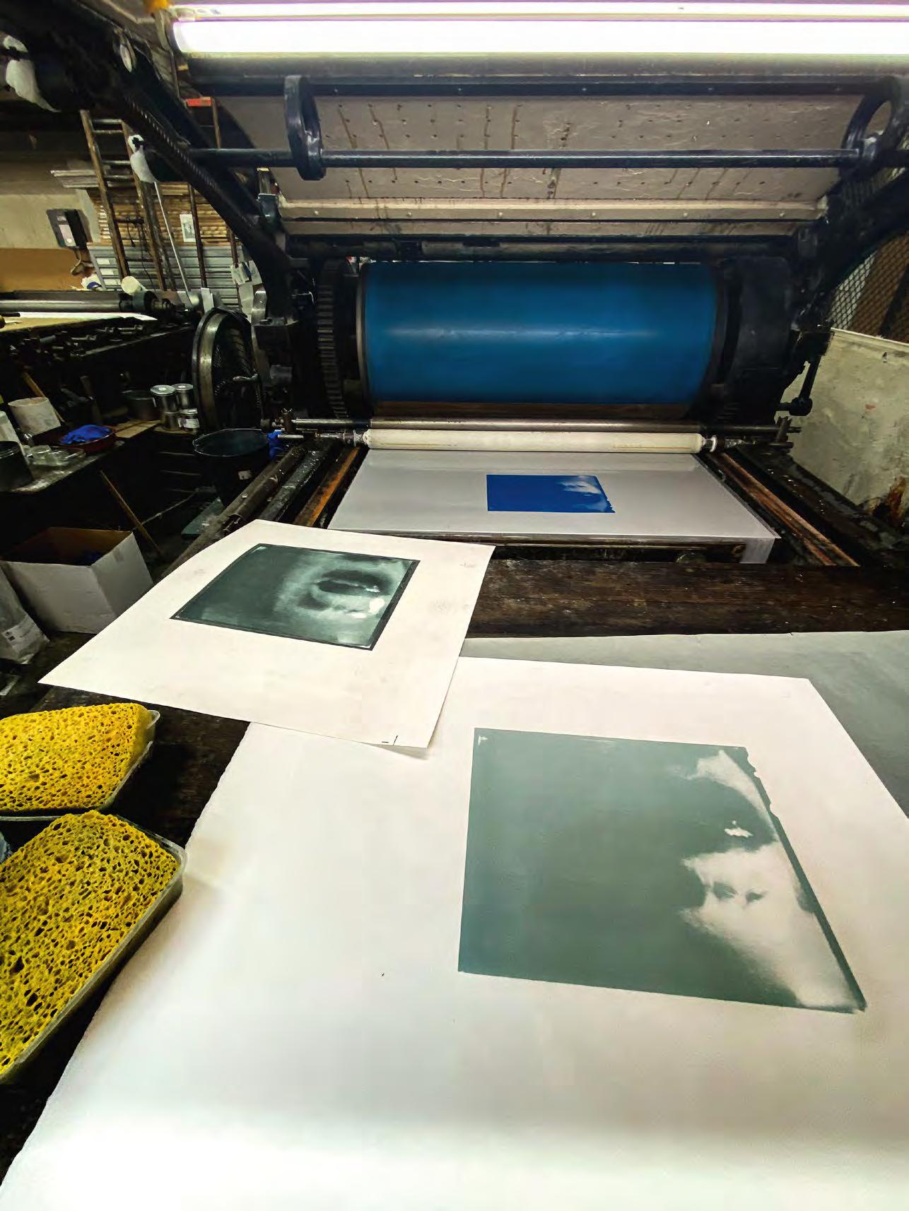 Printmaking is as much about listening as it is about having image emerge on paper. At Idem Paris—a traditional lithography workshop just a few minutes walk from Reid Hall, around the corner from G are du Montparnasse—there may be interludes of stillness, but the mechanical cadence remains a constant. Here, running an edition means alternating one’s attention between the rhythmic clatter of the presses and the viscous hiss of ink spreading over the rollers, each rotation bringing the release of a fresh print. It is not unusual to have several of these enormous machines churning in tandem under Idem’s large glass roof. All have been there since 1881, when French lithographer and engraver Eugène Dufrenoy es tablished the print house to publish special edition maps. Back then the presses were powered through a steam boiler—one that most likely banged and whistled, adding to the overall clangor. The boiler is gone, yet several tons of limestones cut to multiple sizes still remain, stacked in shelves that rise all the way up to the ceiling. A veritable fossil library, produced by the fine accumulation of coral and shells through millions of years on the sea floor, continues to supply the supports for each print. Artists who have used these include Pablo Picasso, Henri Matisse, and Georges Braque, as well as more recently, Sophie Calle, William Kentridge, and David Lynch.