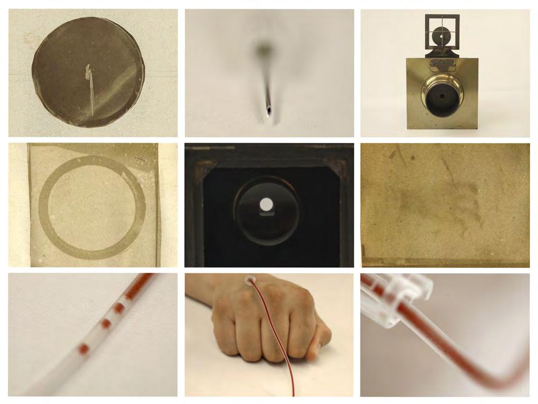 Stills from a film-in-progress featuring a 19th c. Bertsch pinhole camera, self-venipuncture images from the artists, and photographic prints from the Fonds Étienne-Jules Marey at the Collè ge de France, Paris.