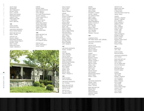 DONORS Robert P. Becker Louis R. Busico Patricia Corbett Christopher J. Cosgrove Jennifer L. Hekking Hon. Andrew M. Hladio Derek R. Layser Mary B. Matterer Hon. Mary S. Much Edward Obertubbesing Charles E. O’Connor Jr. Michael S. Paul Paul J. Perpiglia Arlene B. Rubin Frederick P. Santarelli Jay S. Steinberg Larry D. Sullivan Theodore J. Tacconelli 1989 LEADERSHIP CIRCLE CAPT Robert Taishoff, JAGC, USN (Ret.) LAW SCHOOL ASSOCIATES Lee Trainer CENTURY CLUB Roseanne Raimondo Duffy John Paul Lynch Thomas C. Marconi William L. Prickett DONORS Gerald L. Bowen Jr. Brian A. Carlis Bernard G. Conaway Martin P. Convery Michael T. Droogan Jr. Edward F. Dudley Mary Ann Jordano Jeffrey L. Klein Timothy R. Lawn William Lewis Paul T. Porrini Helen M. Richards Joan Schneikart Michele Squires Sherman David A. Snyder Randall J. Towers 1990 LAW SCHOOL ASSOCIATES Michael J. Brown Leif R. Sigmond Jr. Steven T. Williams BENCH AND BAR CLUB Maryann Brown Peter Chamas Matthew Gitterman Leonard M. Insalaco Craig A. Styer