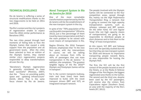 TECHNICAL EXCELLENCE Rio de Janeiro is suffering a series of structural modifications thanks to the two mega-events to be held on 2014 and 2016. The Rio’s context and the city’s projects of regeneration enable to expect from Rio 2016 similar performance as Barcelona 1992. The two cities passed through hard moments of failing bids to host the Olympic Games that caused a wide support from the population and all government levels. After the cities been selected to host an edition of the Olympic Games, they started similar city’s regeneration projects responsible to deep transformations all over the city. ”Barcelona’s Olympic regeneration is generally considered to have been successful” (Monclús, 2007), due the “focus on providing public space and updating infrastructure” (Smith, 2011). That is the same focus chosen by Rio de Janeiro.