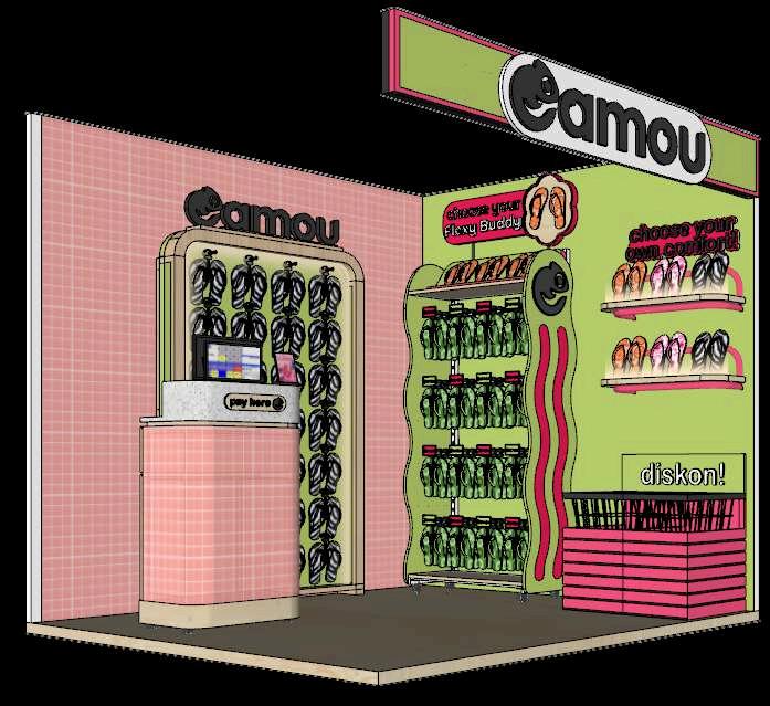 Camou Booth is a compact exhibition booth designed to showcase Camou's sandal products in a clean and eye-catching way. The design emphasizes modularity and brand visibility, using a minimalist layout, natural materials, and strong visual identity. My role included concept development, 3D modeling, and creating detailed drawings to ensure the booth was both functional and visually appealing in a limited space.6,25 m²