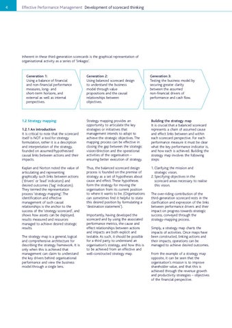 1.2 Strategy mapping: 1.2.1 An introduction It is critical to note that the scorecard itself is NOT a tool for strategy formulation, rather it is a description and interpretation of the strategy, founded on assumed/hypothesised causal links between actions and their impacts. Kaplan and Norton noted the value of articulating and representing graphically such links between actions (‘drivers’ or ‘lead’ indicators) and desired outcomes (‘lag’ indicators). They termed the representation process ‘strategy mapping’. The identification and effective management of such causal relationships is the anchor to the success of the ‘strategy scorecard’, and shows how assets can be deployed, results measured and resources managed to achieve desired strategic results. The strategy map is a general, logical and comprehensive architecture for describing the strategy framework. It is only when this is achieved that management can claim to understand the key drivers behind organisational performance and view the business model through a single lens.