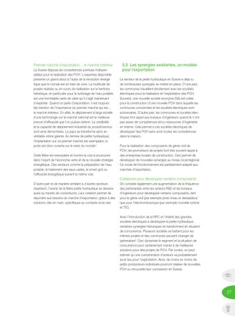 3.3 Les synergies existantes, un modèle pour l’exportation Le secteur de la petite hydraulique en Suisse a déjà vu de nombreuses synergies se mettre en place. D’une part, les communes travaillent étroitement avec les sociétés électriques pour la réalisation et l’exploitation des PCH. Souvent, une nouvelle société anonyme (SA) est créée pour la construction d’une nouvelle PCH dans laquelle les communes concernées et les sociétés électriques sont actionnaires. D’autre part, les communes et sociétés électriques font appel aux bureaux d’ingénieurs quand ils n’ont pas assez de compétences et/ou ressources d’ingénierie en interne. Cela permet à ces sociétés électriques de développer des PCH sans avoir toutes les compétences dans la maison. Pour la réalisation des composants de génie civil de PCH, les promoteurs de projets font très souvent appel à des entreprises locales de construction. Ceci permet de développer de nouvelles synergies au niveau local/régional. Ce mode de fonctionnement est parfaitement adapté aux marchés d’exportation.