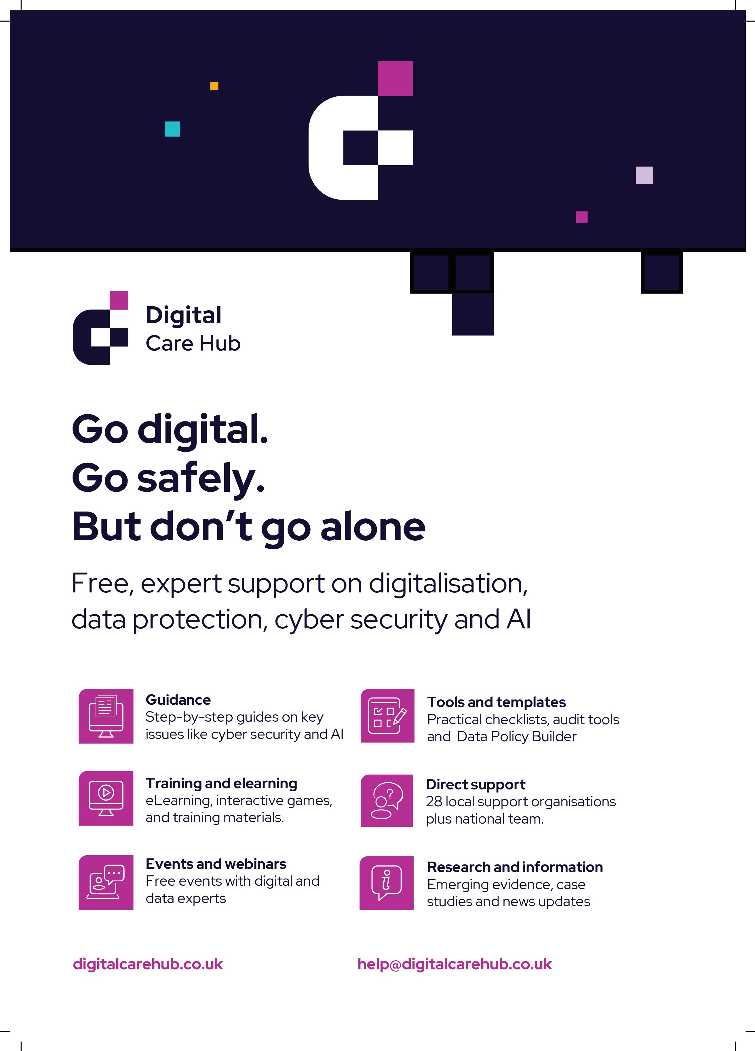 The Digital Care Hub offers free support on cybersecurity, including guidance, e-learning, template policies, checklists, a national helpline, and support from 28 Better Security, Better Care local partners across England.