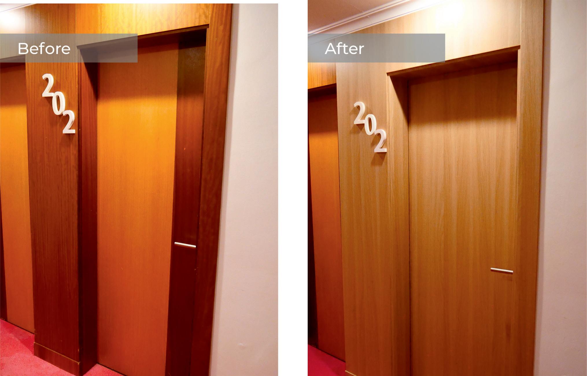 Re:surface specialises in the art of transformation - reviving tired, dated or worn surfaces and restoring them to a new chapter of life. Using precision-applied architectural films and wraps, the brand brings fresh elegance to doors, walls, wardrobes, and case goods without the disruption of traditional refurbishment. The process is quick, quiet, and remarkably refined - often completed while the rest of the hotel continues to operate as usual.