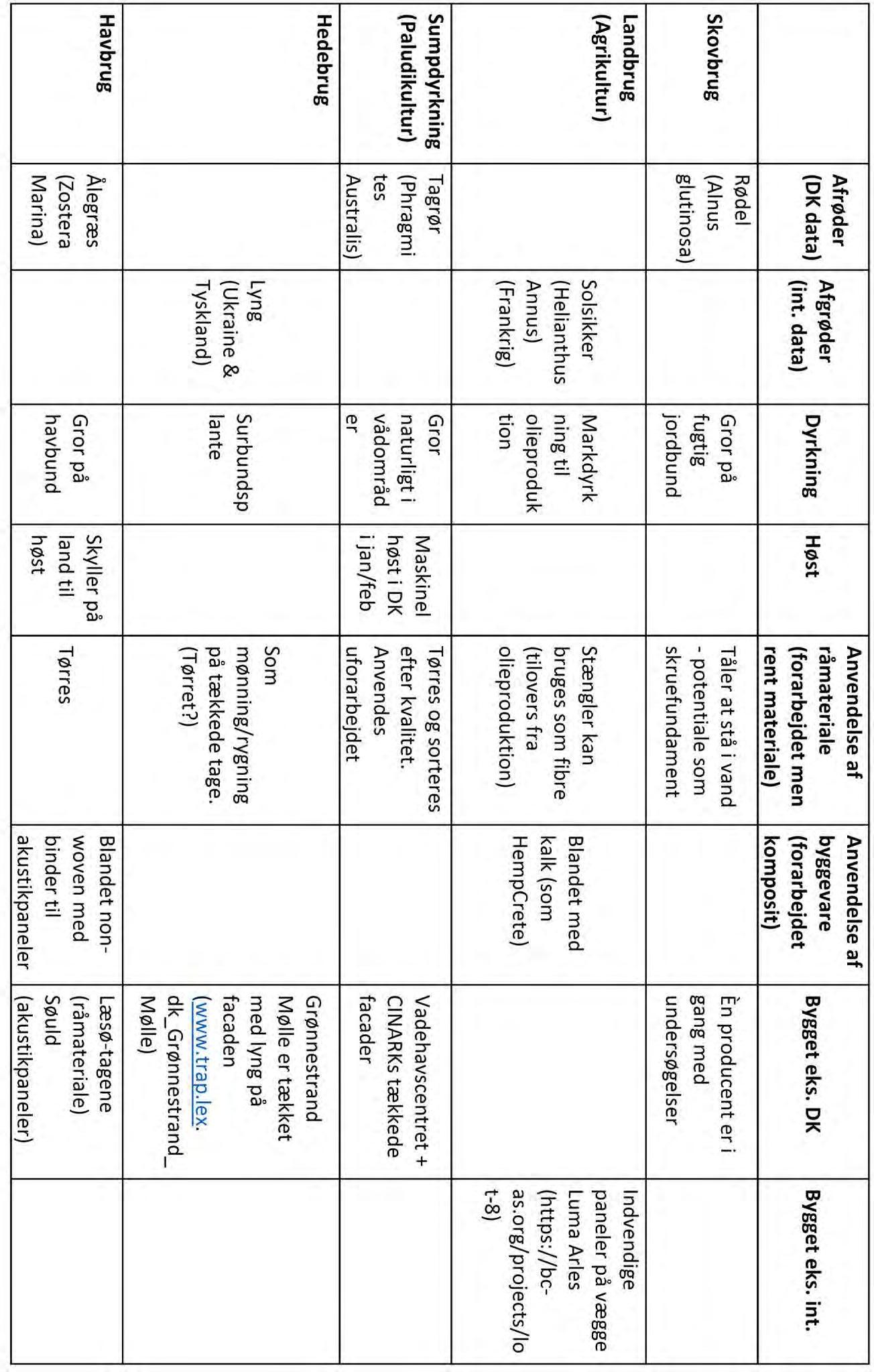 Udover hedebrug fremstår paludikultur og havbrug som værende mindst udnyttet, selvom tagrør og ålegræs er gode og velkendte byggematerialer i den historiske byggekultur.