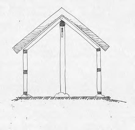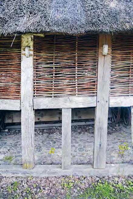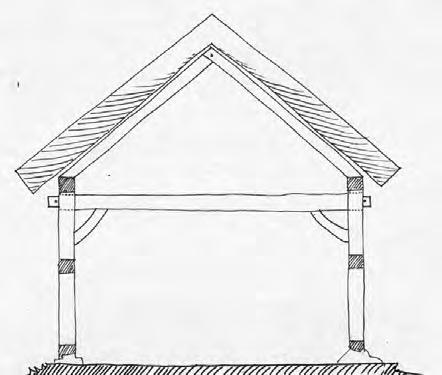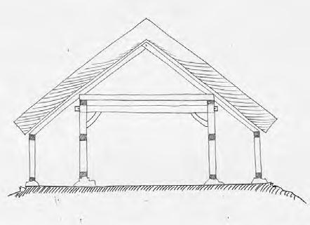 mentet på en bundrem og afsluttes mod taget med en toprem, der begge er tømmerstokke ligesom resten af konstruktionen, men gerne af en højere kvalitet, end de øvrige (Hans Becker-Larsen, 2004).