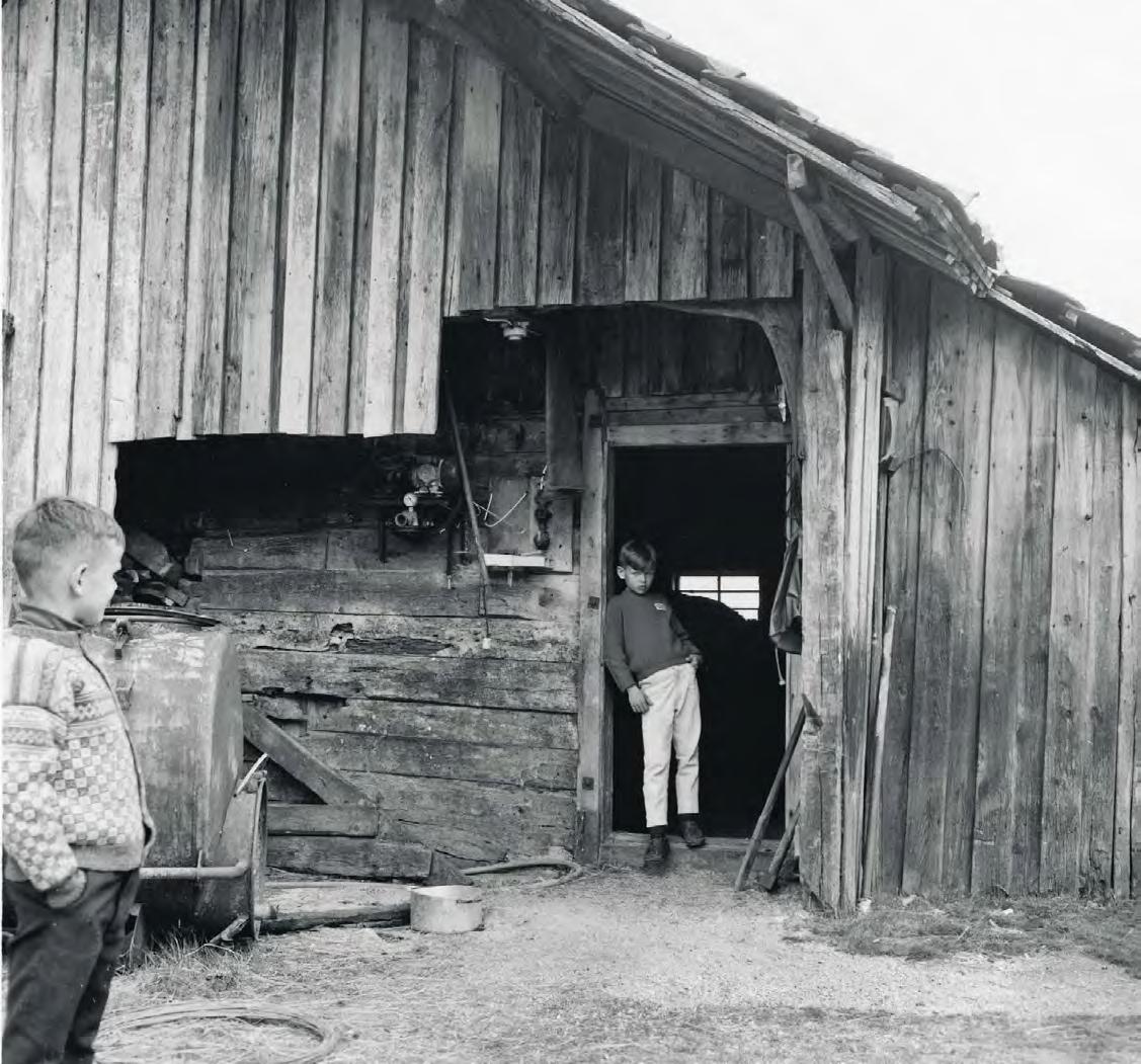 FIG 1: Badstue fra Setesdalen opført som blokhuskonstruktion med rundede knuder. Stokkene er let afrettet. I baggrunden anes en fleretages gård med højt fundament i sten, hvori der også er indlagt funktioner. Henrik Vensild ca. 1900. © Nationalmuseets online samlinger