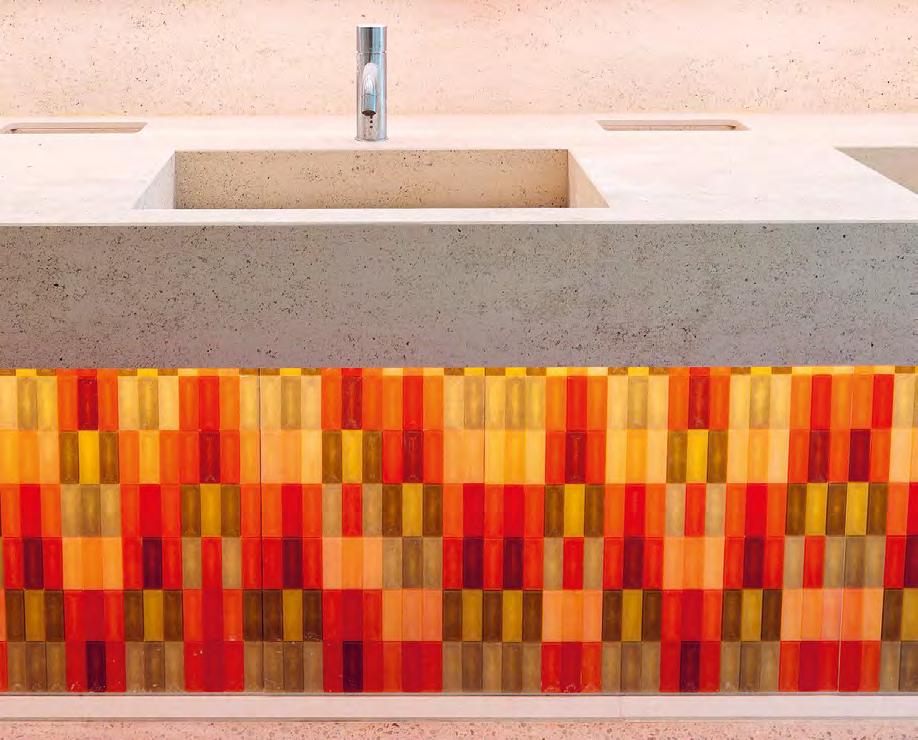Ateliér Luma har fremstillet vægfliser af salt som beklædning på indervægge i The Tower i Arles af Frank Gehry. ª