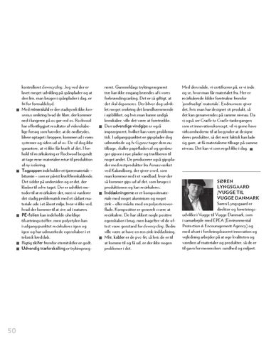 kontrolleret downcycling. Jeg ved der er lavet meget udvikling på spånplader og at den lim, man bruger i spånplader i dag, er fri for formaldehyd. Med mineraluld er der stadigvæk ikke konsensus omkring hvad de fibre, der kommer ned i lungerne på os gør ved os. Rockwool har offentliggjort resultater af videnskabelige forsøg som hævder, at de nedbrydes, bliver optaget i kroppen, kommer ud i vores systemer og siden ud af os. De vil dog ikke garantere, at vi ikke får kræft af det. I forhold til recirkulering er Rockwool begyndt at tage rene materialer retur til produktion af ny isolering. Tagpappen indeholder et tjæremateriale – bitumin – som er påvist kræftfremkaldende. Det sidder på undersiden og er det, der klæber til selve taget. Der er udviklet metoder til at recirkulere det, men vi vurderer det stadig problematisk med et sådant materiale ude i et åbent miljø, hvor vi ikke ved, hvad der kommer til at sive ud i naturen. PE-folien kan indeholde uheldige tilsætningsstoffer, men polyetylen kan i udgangspunktet recirkuleres igen og igen og har udmærkede egenskaber i et teknisk kredsløb. Rigtig skifer fremfor eternitskifer er godt. Udvendig træforskalling er trykimpræg-