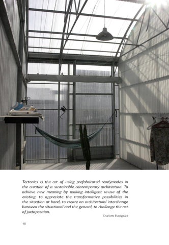 Tectonics is the art of using prefabricated readymades in the creation of a sustainable contemporary architecture. To achieve new meaning by making intelligent re-use of the existing, to appreciate the transformative possibilities in the situation at hand, to create an architectural interchange between the situational and the general, to challenge the act of juxtaposition. Charlotte Bundgaard 18
