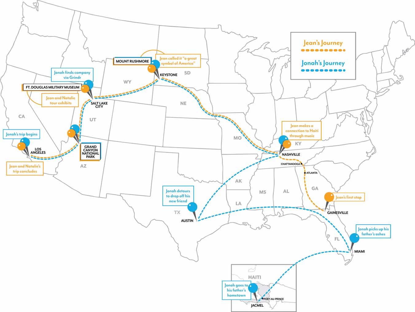 Where the Mountain Meets the Sea depicts the parallel cross-country journeys of a father and son, connected by memories and mountain music. Before Jonah was born, his parents took a trip from Miami to Los Angeles to explore America, their new chosen home. Years later, Jonah takes the trip in reverse to better understand his father’s life and legacy. The map above highlights the cities and landmarks mentioned throughout their travels.