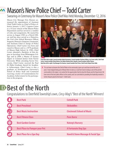 Swearing-in Ceremony for Mason’s New Police Chief Was Held Monday, December 12, 2016 Mason City Manager Eric Hansen announced the appointment of Assistant Chief Todd Carter to Chief of Police effective January 1, 2017. Captain Carter is a 33-year veteran of the Mason Police Department and has served in a number of roles and assignments. He started his service in August 1983 as a Patrol Officer and has since served as a Detective, the City’s first School Resource Officer, Sergeant, Detective Sergeant, Lieutenant, and Assistant Chief in charge of Police Operations. Chief Carter was born and raised in Mason and is a 1978 graduate of Mason High School. In 1982, Chief Carter obtained a Bachelor of Arts degree in Sociology from Wilmington College and in 2006 a Master of Science degree in Criminal Justice from Xavier University. While attending Xavier University, Chief Carter received the Paul H. Hahn Graduate Award for Academic Achievement. Chief Carter is also a graduate of Northwestern University’s School of Police Staff and Command receiving a Letter of Commendation for Academic Achievement for his participation in the program.