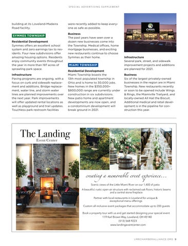 were recently added to keep everyone as safe as possible. Business The past years have seen over a dozen new businesses come into the Township. Medical offices, home mortgage businesses, and exciting new restaurants continue to choose Symmes as their home. MIAMI TOWNSHIP Residential Development Miami Township boasts the 13th most populated township in Ohio and is home to 30,000 jobs. New homes in the $350,000– $800,000 range are currently under construction in six subdivisions. New patio home and apartment developments are now open, and a condominium development will break ground in 2021.