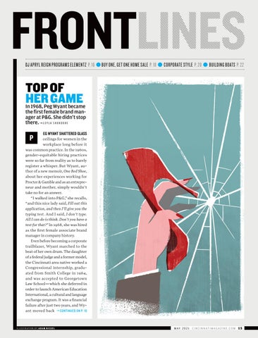 ceilings for women in the workplace long before it was common practice. In the 1960s, gender-equitable hiring practices were so far from reality as to barely register a whisper. But Wyant, author of a new memoir, One Red Shoe, about her experiences working for Procter & Gamble and as an entrepreneur and mother, simply wouldn’t take no for an answer. “I walked into P&G,” she recalls, “and this nice lady said, Fill out this application, and then I’ll give you the typing test. And I said, I don’t type. All I can do is think. Don’t you have a test for that?” In 1968, she was hired as the first female associate brand manager in company history. Even before becoming a corporate trailblazer, Wyant marched to the beat of her own drum. The daughter of a federal judge and a former model, the Cincinnati area native worked a Congressional internship, graduated from Smith College in 1964, and was accepted to Georgetown Law School—which she deferred in order to launch American Education International, a cultural and language exchange program. It was a financial failure after just two years, and Wyant moved back CONTINUED ON P. 16
