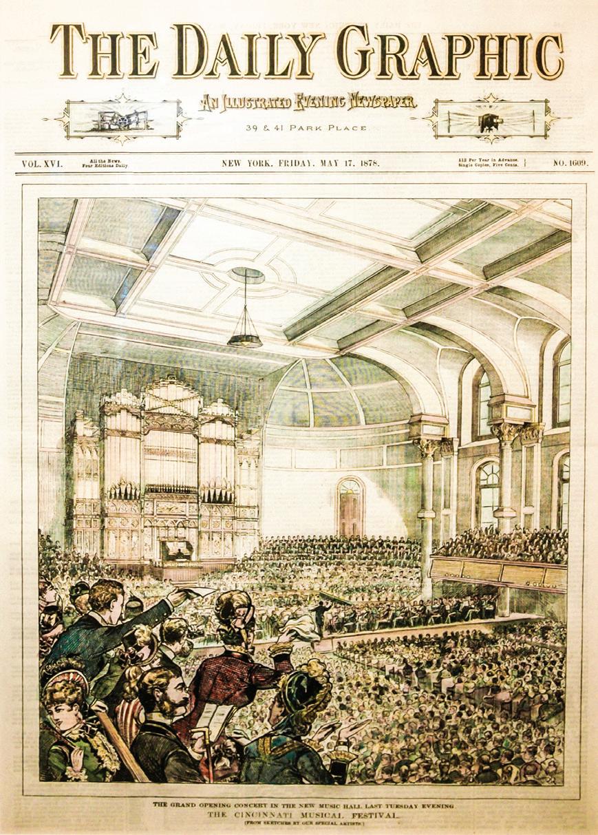 Less than three decades later in 1873, the first Cincinnati May Festival was held, bringing together the English and German singing traditions found in early Cincinnati. The May Festival continues today as the longest-running choral festival in the Western Hemisphere. Craig Doolin’s article, “Beginnings of the Cincinnati May Festival and Music Hall” on page 14, tells us more about the early history of the May Festival.