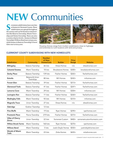 eventeen subdivisions have new lots or homes in Clermont County. These subdivisions are spread throughout the county and can be found in communities like Batavia Township, Miami Township and Union Township. There are also a variety of price levels—homes in Miami Township’s Willows Bend start at $550,000, while homes in Batavia Township’s Forest Glen start at $213,000.