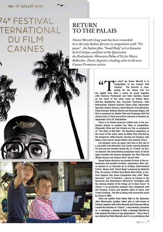 RETURN TO THE PALAIS Nanni Moretti’s long wait has been rewarded: he is the only Italian director in competition with “Tre piani”. An Italian film, “Small Body” at La Semaine de la Critique, and four at the Quinzaine des Realisateurs. Honorary Palme d’Or for Marco Bellocchio. Dario Argento: a leading actor in the new Cannes Premieres section