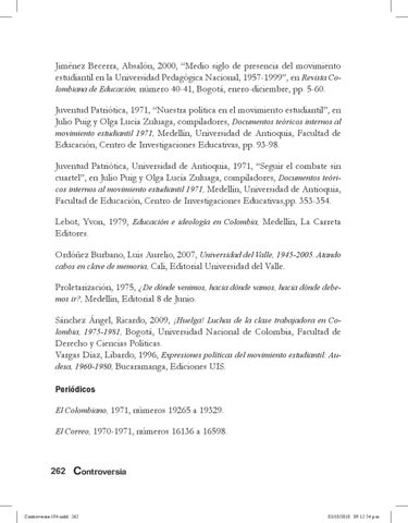 Jiménez Becerra, Absalón, 2000, “Medio siglo de presencia del movimiento estudiantil en la Universidad Pedagógica Nacional, 1957-1999”, en Revista Colombiana de Educación, número 40-41, Bogotá, enero-diciembre, pp. 5-60. Juventud Patriótica, 1971, “Nuestra política en el movimiento estudiantil”, en Julio Puig y Olga Lucía Zuluaga, compiladores, Documentos teóricos internos al movimiento estudiantil 1971, Medellín, Universidad de Antioquia, Facultad de Educación, Centro de Investigaciones Educativas, pp. 93-98. Juventud Patriótica, Universidad de Antioquia, 1971, “Seguir el combate sin cuartel”, en Julio Puig y Olga Lucía Zuluaga, compiladores, Documentos teóricos internos al movimiento estudiantil 1971, Medellín, Universidad de Antioquia, Facultad de Educación, Centro de Investigaciones Educativas,pp. 353-354. Lebot, Yvon, 1979, Educación e ideología en Colombia, Medellín, La Carreta Editores. Ordóñez Burbano, Luis Aurelio, 2007, Universidad del Valle, 1945-2005. Atando cabos en clave de memoria, Cali, Editorial Universidad del Valle. Proletarización, 1975, ¿De dónde venimos, hacia dónde vamos, hacia dónde debemos ir?, Medellín, Editorial 8 de Junio. Sánchez Ángel, Ricardo, 2009, ¡Huelga! Luchas de la clase trabajadora en Colombia, 1975-1981, Bogotá, Universidad Nacional de Colombia, Facultad de Derecho y Ciencias Políticas. Vargas Díaz, Libardo, 1996, Expresiones políticas del movimiento estudiantil: Audesa, 1960-1980, Bucaramanga, Ediciones UIS. Periódicos El Colombiano, 1971, números 19265 a 19329. El Correo, 1970-1971, números 16136 a 16598.