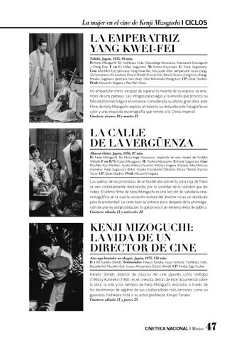 Kenji Mizoguchi: la vida de un director de cine Aru eiga-kantoku no shogai, Japón, 1975, 150 min. D y G: Kaneto Shindô. Testimonios: Kinuyo Tanaka, Isuzu Yamada, Yoshikata Yoda, Daisuke Itô, Machiko Kyô, Yasuzo Masumura, Eitarô Shindô. CP: Kindai Eiga Kyokai.