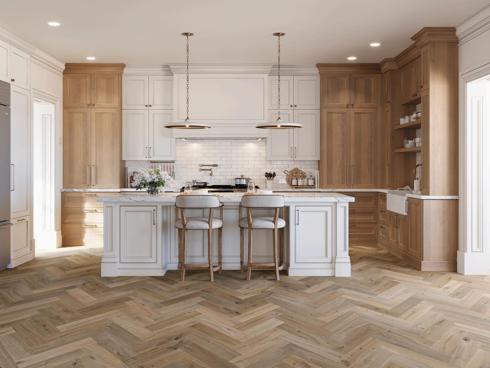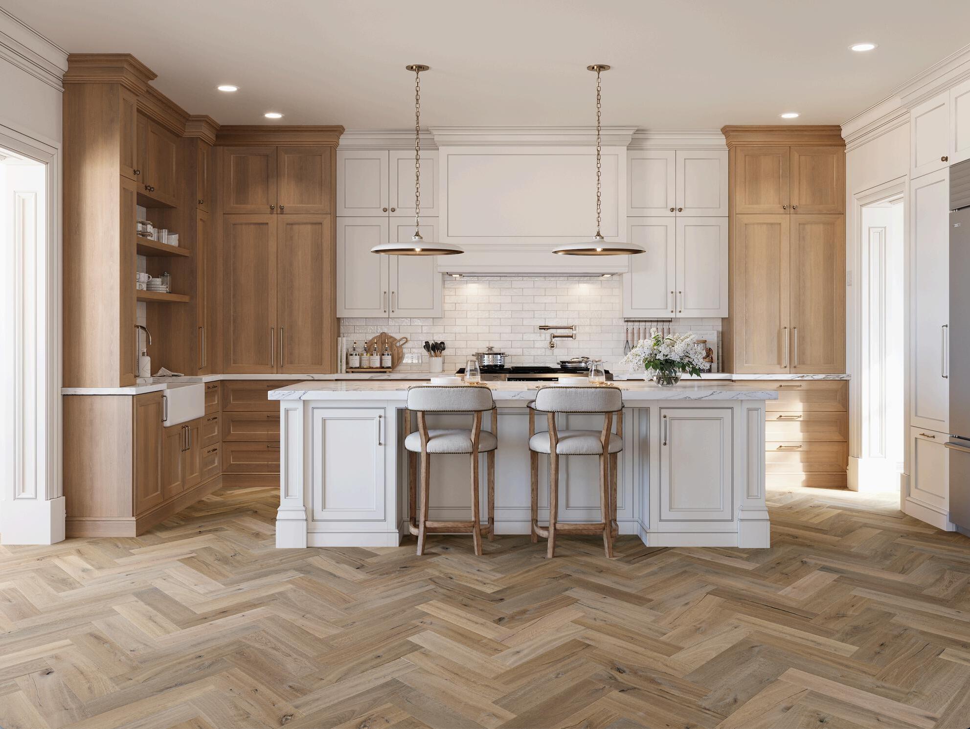 The classic herringbone layout enhances its sophistication, creating a floor that is both refined and full of authentic heritage.