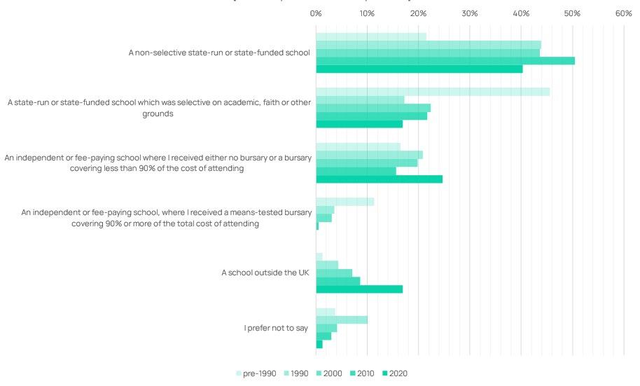 The majority (66%) of members were educated in UK state schools with 19% educated in fee-paying schools. In the 2020s, the proportion of recruits from feepaying schools has increased to 25%, which is a concern for the inclusivity of the profession considering that only 9% of British pupils are educated in fee-paying schools. 10% of respondents indicated that they were entitled to free school meals while at school. The proportion of recruits from “Oxbridge” has remained between 20% and 26% with 40% to 52% from other Russel Group universities.
