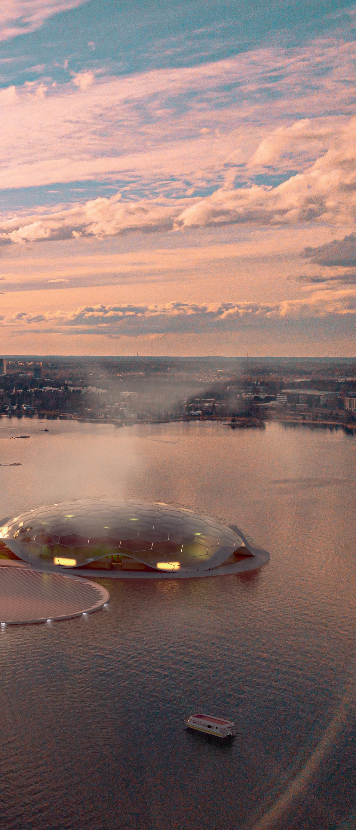 “Titled Hot Heart, the project is based on an archipelago of heat-storing basins with the dual function of storing thermal energy and serving as a hub for recreational activities. The “islands” will also be home to tropical forests and ecosystems from around the world, giving the Finnish capital additional public space and a new educational attraction. .”