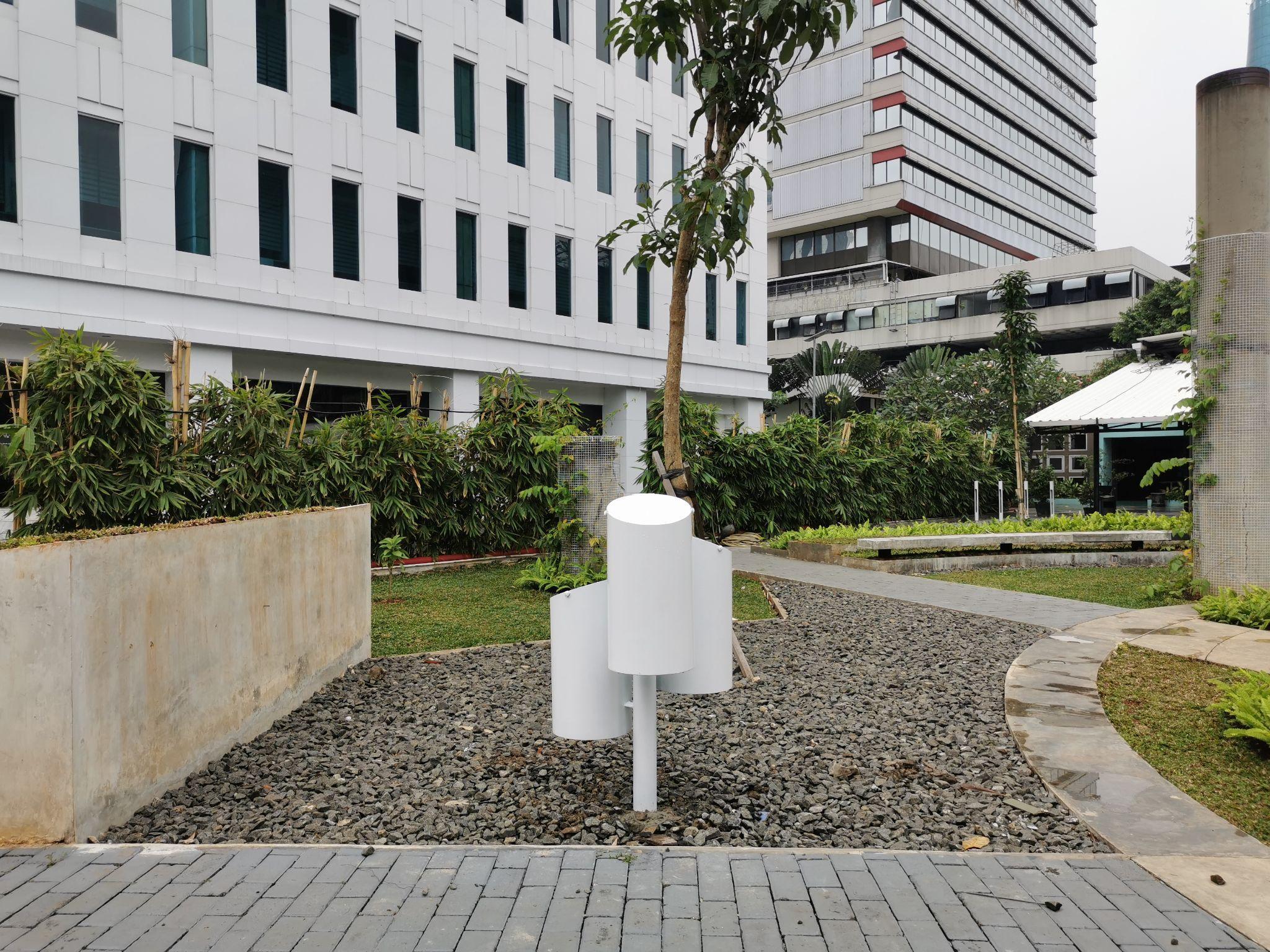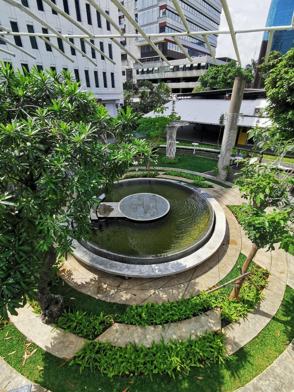 The total area of the plaza is 1300 m2. The pond in the middle of the plaza cools down the temperature of the area and uses shell and organic materials. This plaza was designed to harvest rainwater to water the plants in this plaza.