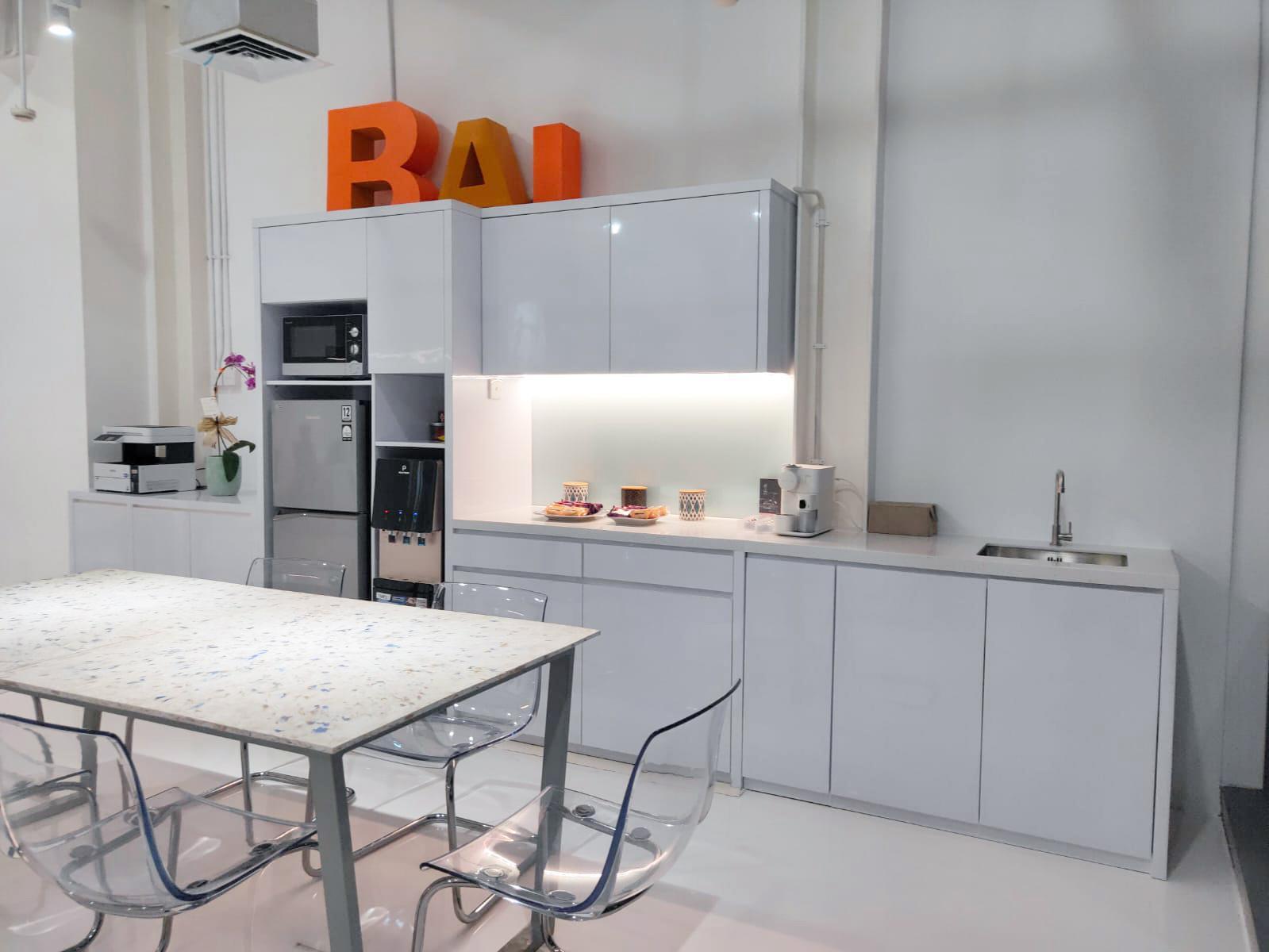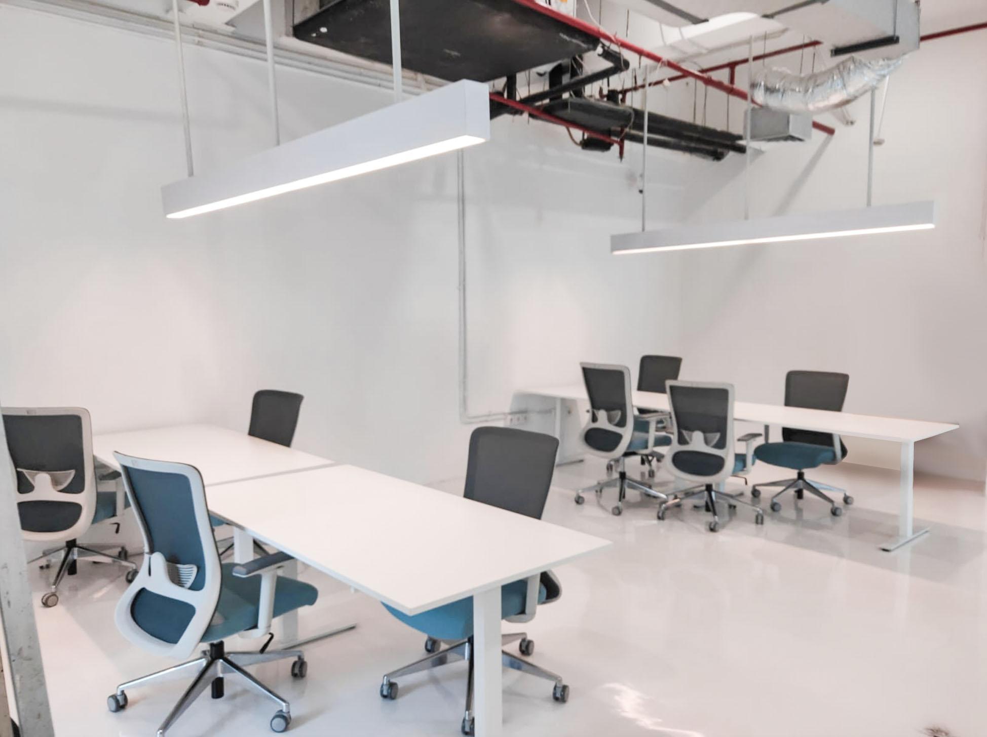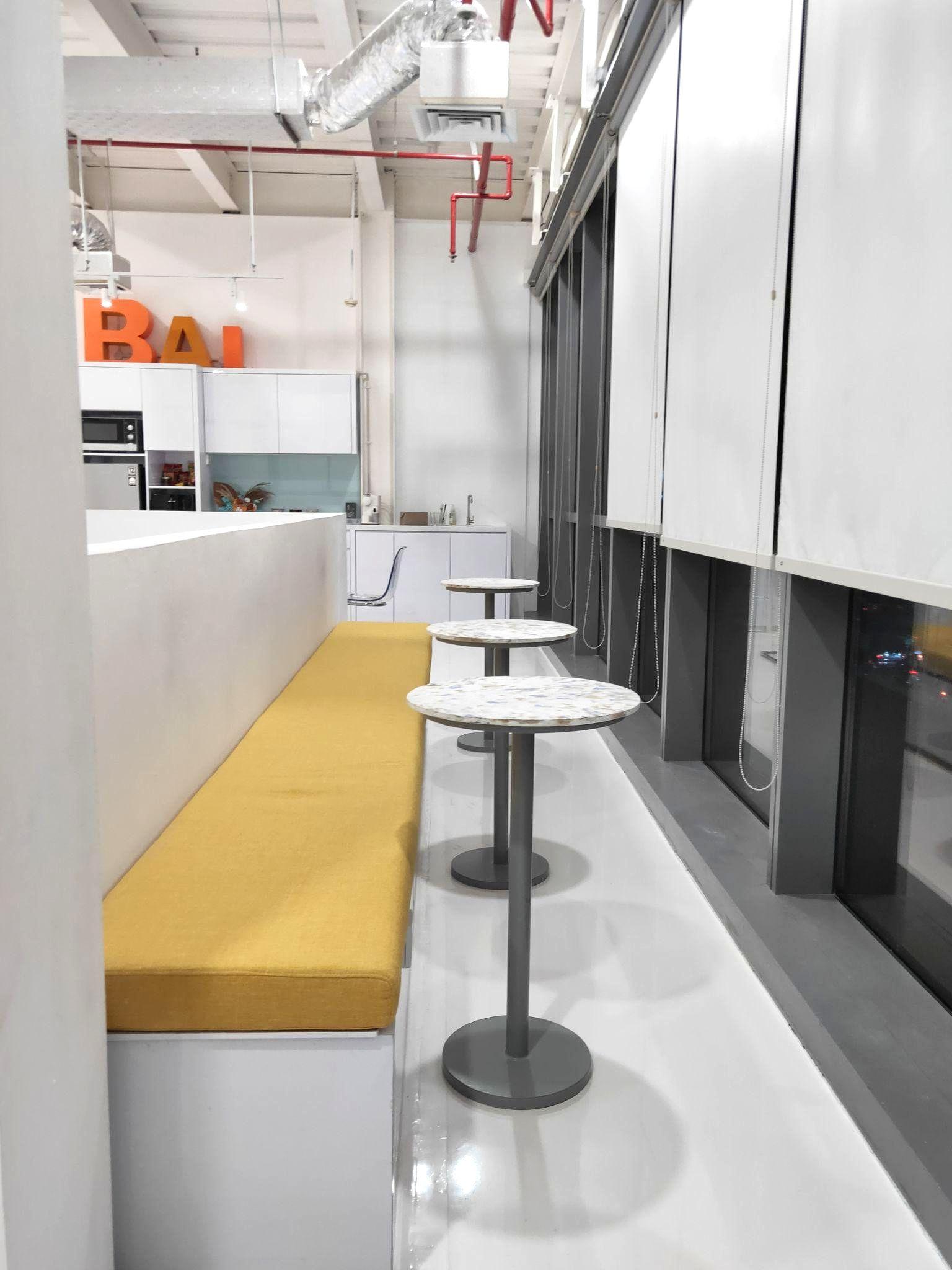 The lab and the common area are separated by a giant wall with a glass frame window on top to let the lighting shine through and create a sense of openness. Overall for the interior, the tone being used is different shades of white color. We play with different textures to enrich the ambiance of this place. The outdoor lab is a 6 ft custom container that was designed under the supervision of a lab expert from Australia.
