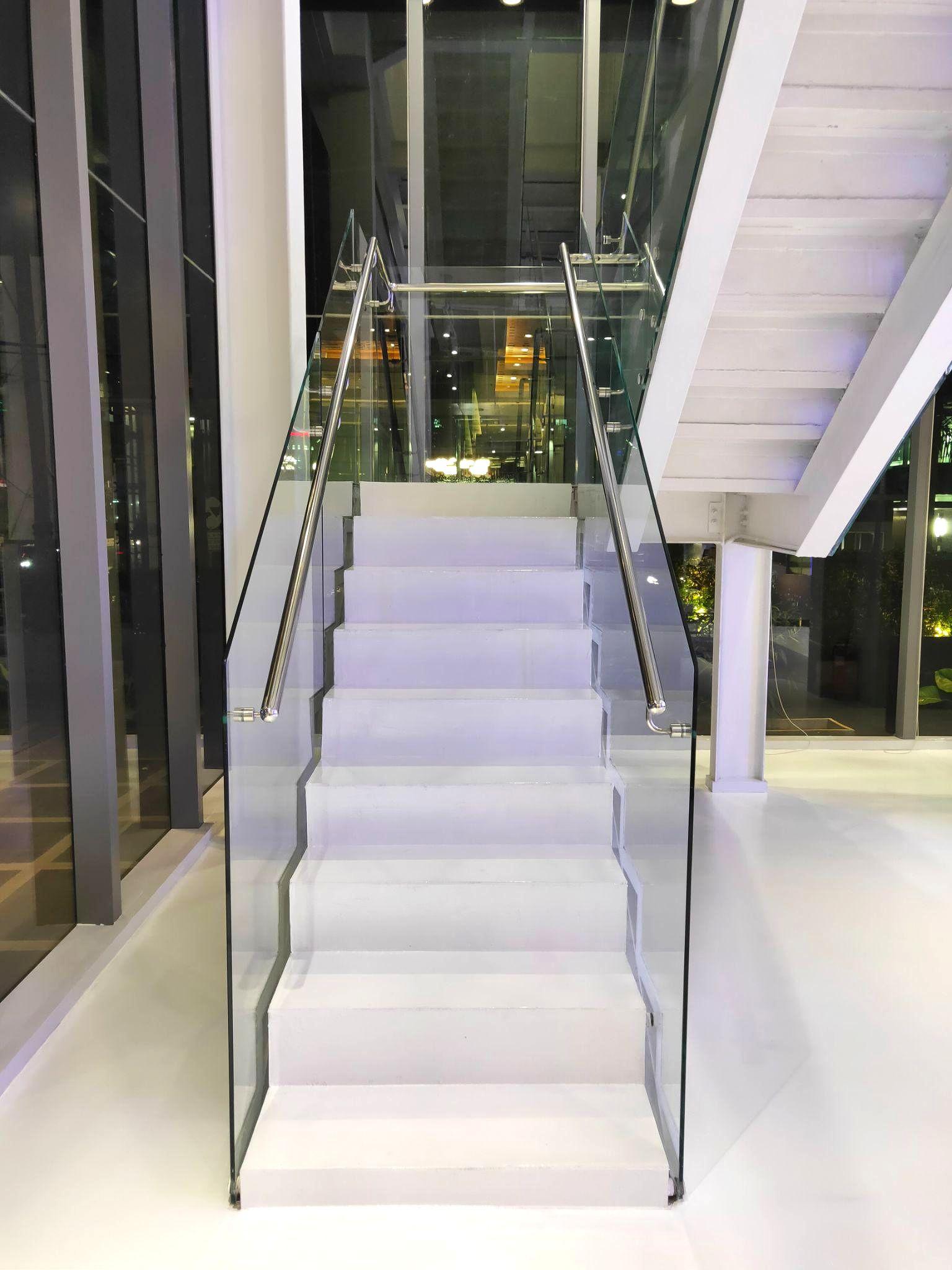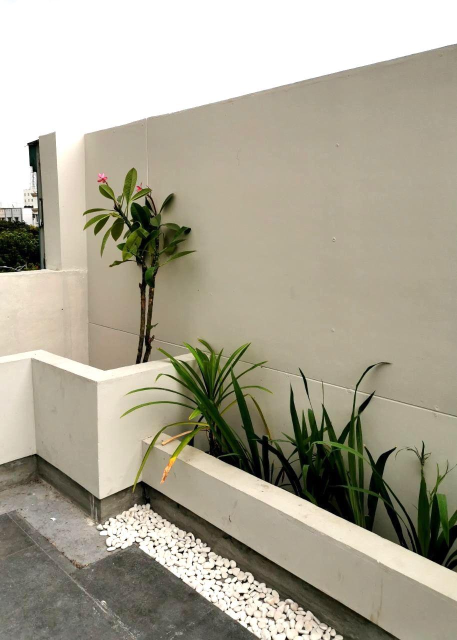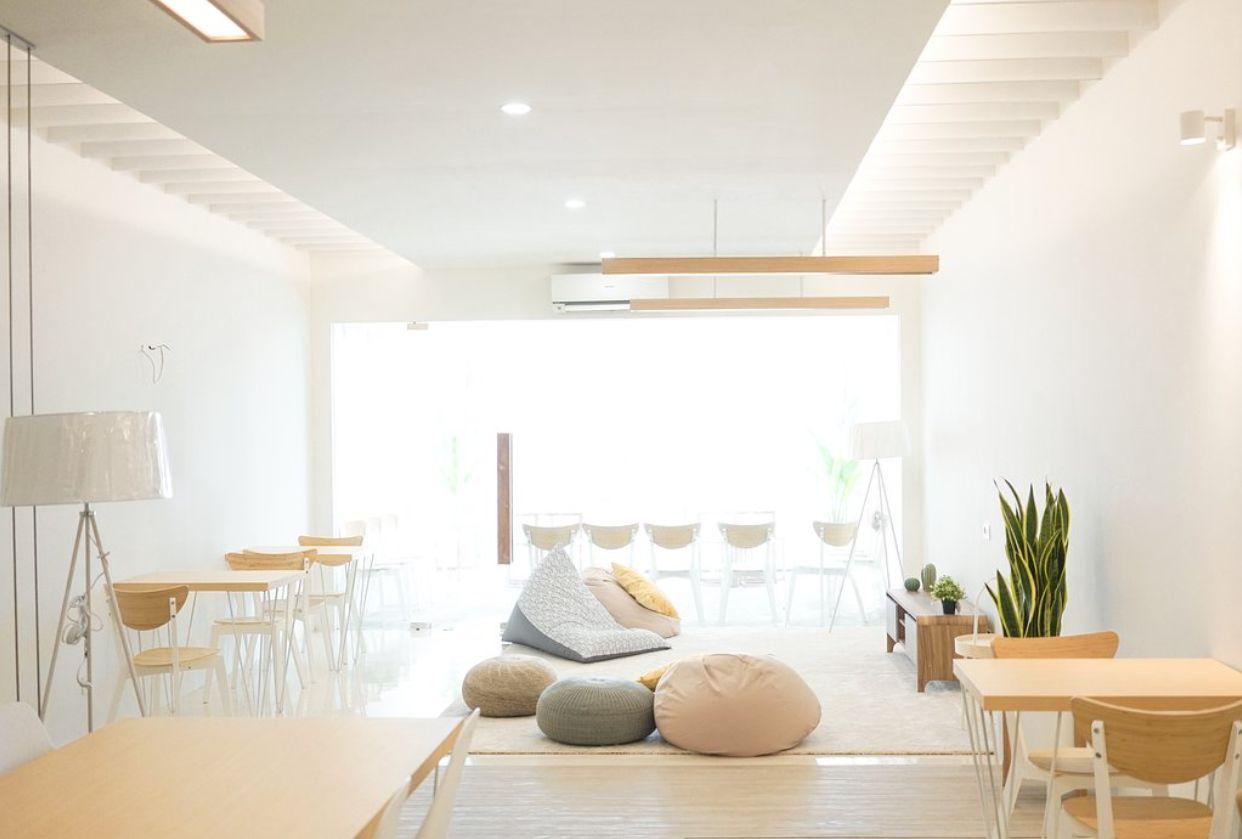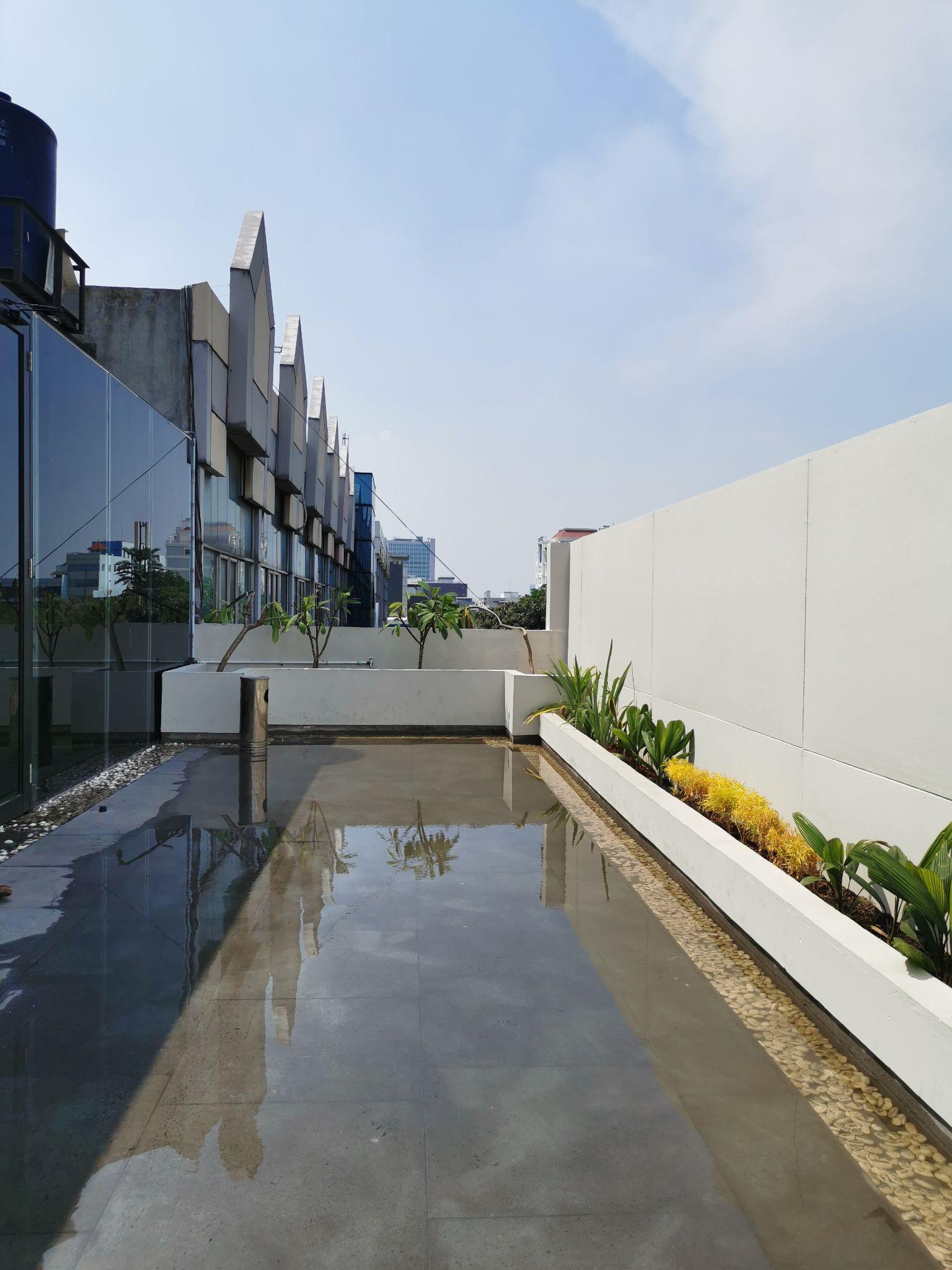 The lab and the common area are separated by a giant wall with a glass frame window on top to let the lighting shine through and create a sense of openness. Overall for the interior, the tone being used is different shades of white color. We play with different textures to enrich the ambiance of this place. The outdoor lab is a 6 ft custom container that was designed under the supervision of a lab expert from Australia.