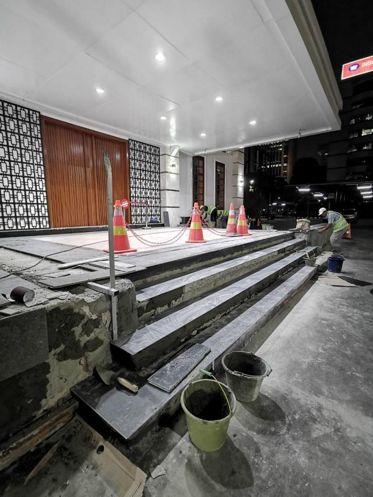 Most of the materials being used have been curated from the previous plaza. The pavings are from the original plaza and are kept during the demolition process. There was a billboard structure inside this area that is sorted and cut to make the seating and parts of structures of some elements in thisnewEnergyPlazaatKementrianESDM.