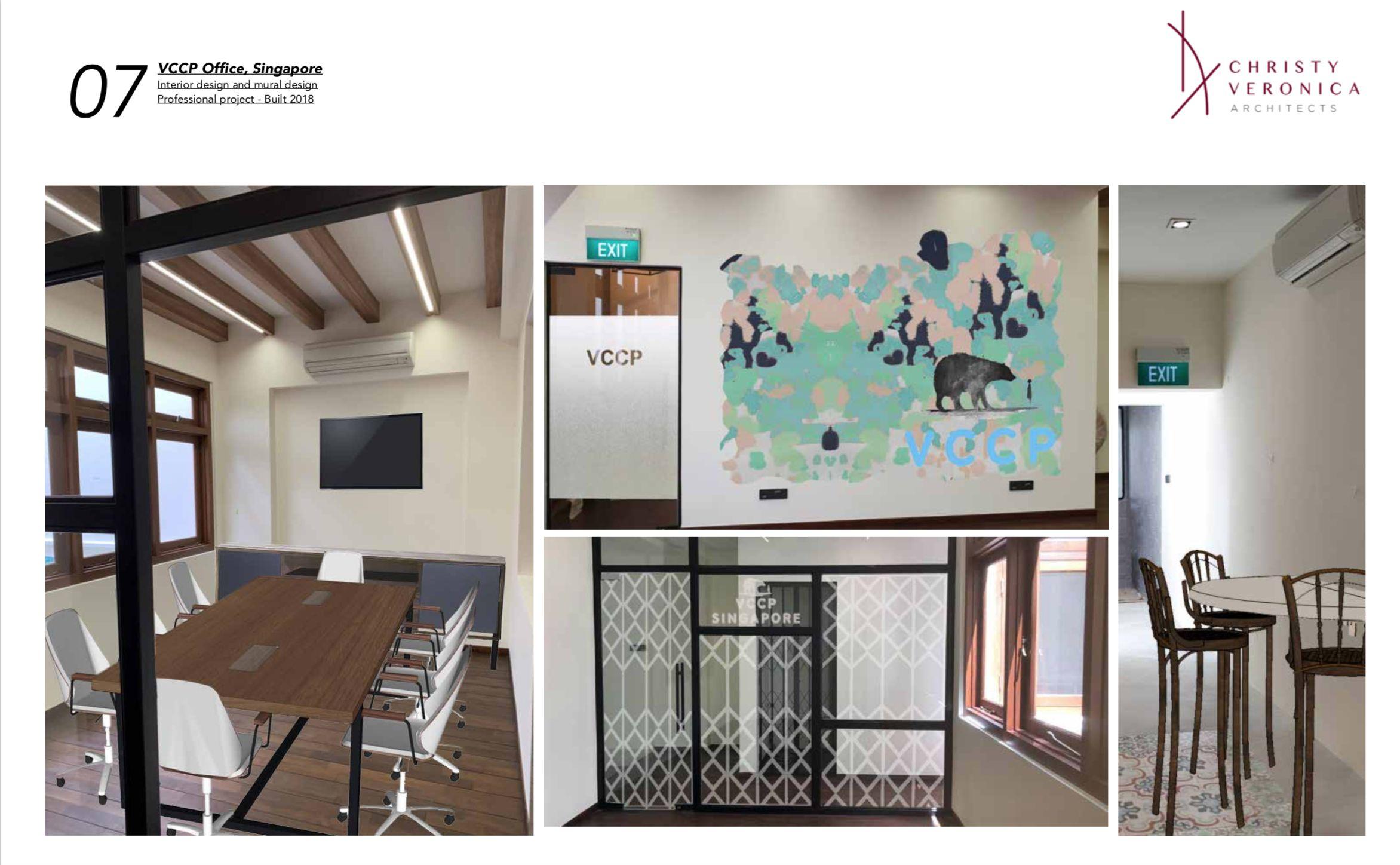 Thisofficeislocatedinashophouse in Singapore. The mural was designed to create a vibrant vibe for this agency. The pattern of the sticker on the glass door was inspired by the original window trellis. A minimum interruption is required upon designing wall panelsandbringinginequipment.