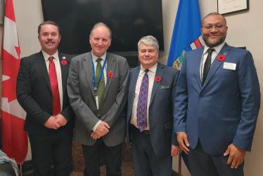 L-R: Tara Sawyer, MLA for Olds-Didsbury-Three Hills, Kevin Magill, PQS, Ibrahim Oladapo, PQS, Ron Wiebe, MLA for Grand Prairie-Wapiti and Parliamentary Secretary for Rural Health (North), Tany Yao, MLA for Fort McMurray-Wood Buffalo and Deputy Government Whip and Parliamentary Secretary for Small Business and Northern Development, Wyatt Clairmont, PQS, and Garth Roswell, MLA for Vermillion-Lloydminster-Wainwright.