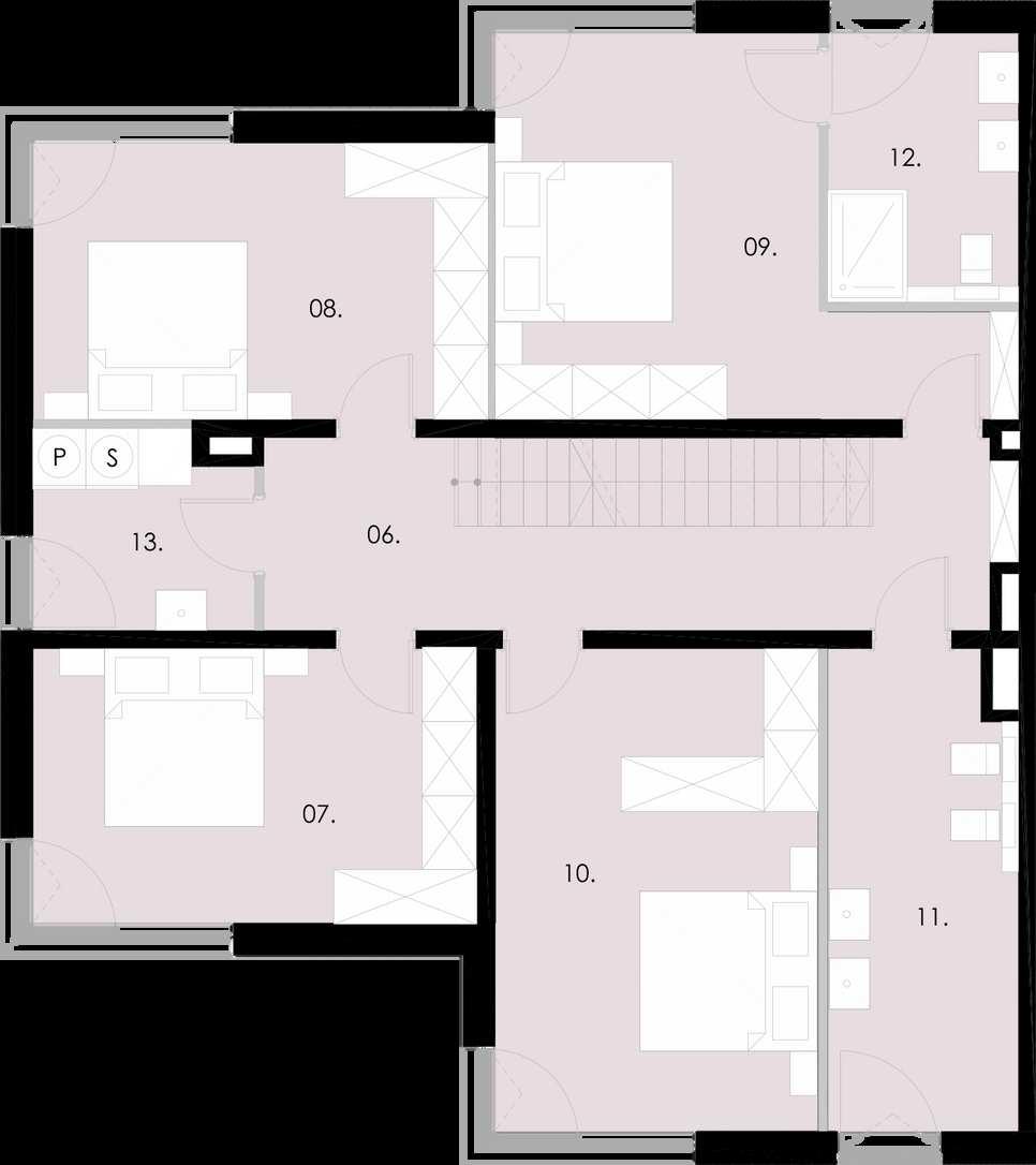 01. Hall 02. Stairs 03. Living room with kitchen 04. Toilet 05. Office 06. Storage 07. Garage Level 1 | 124,4 m ²